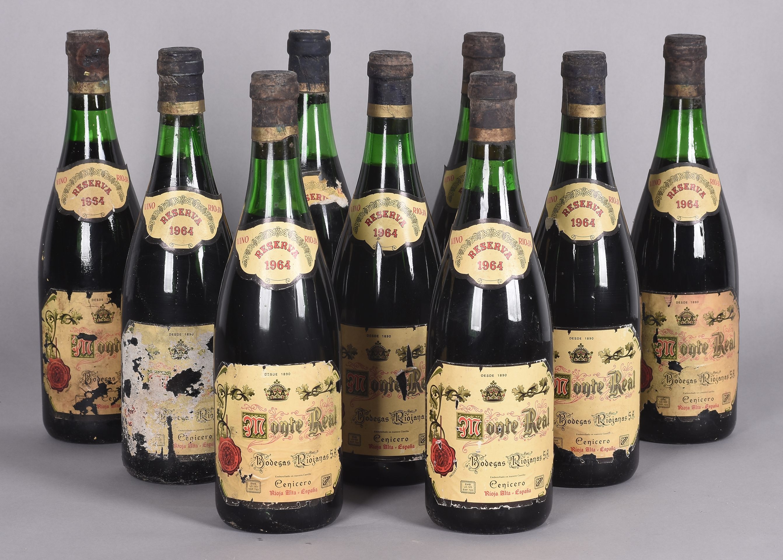 Lote compuesto por 9 botellas de vino tinto Bodegas Riojanas MONTE REAL Reserva 1964. Cenicero La Rioja