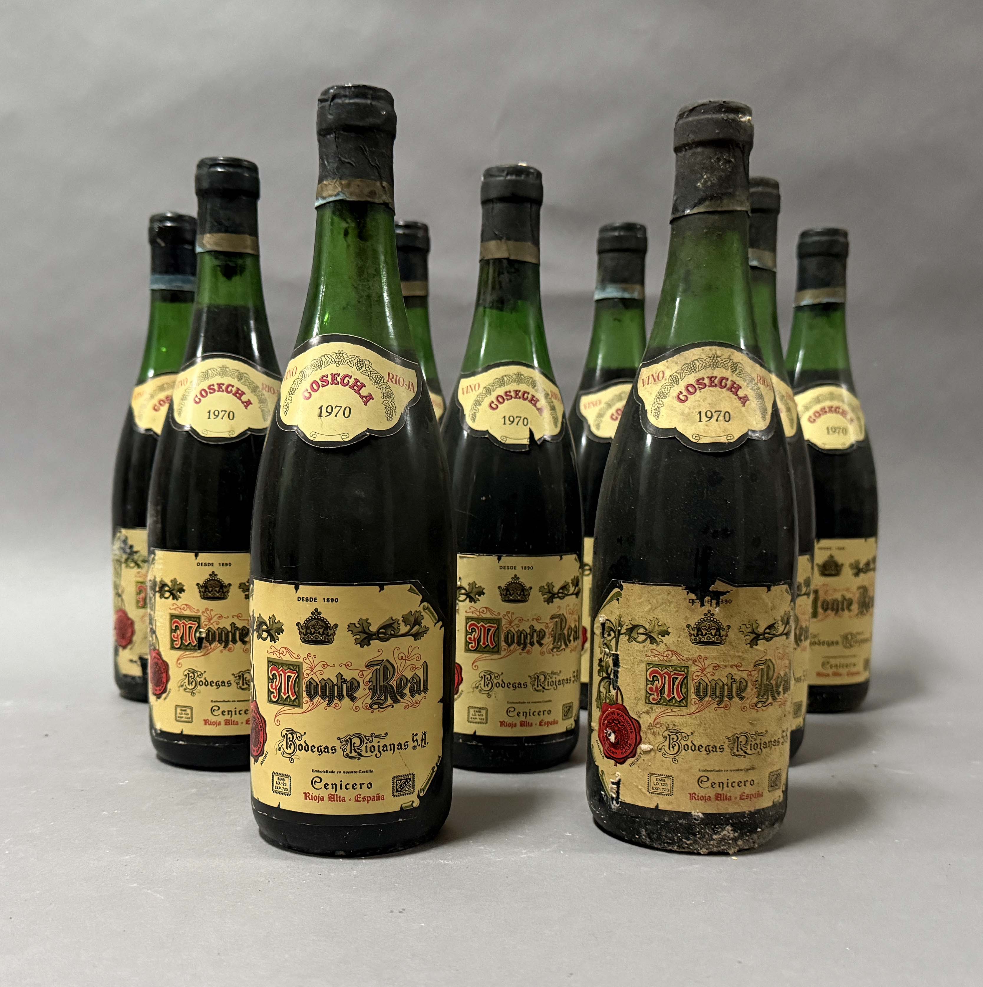 Lote compuesto por 9 botellas de vino tinto Bodegas Riojanas MONTE REAL crianza 1970. Cenicero La Rioja