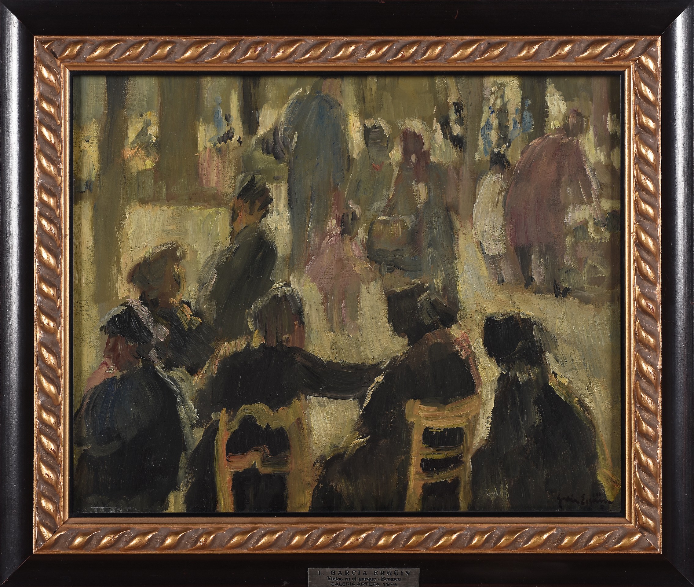 IÑAKI GARCÍA ERGÜÍN(Bilbao, Bizkaia, 1934)"Mujeres en el parque. Bermeo"Óleo sobre lienzo32 x 40 cm
