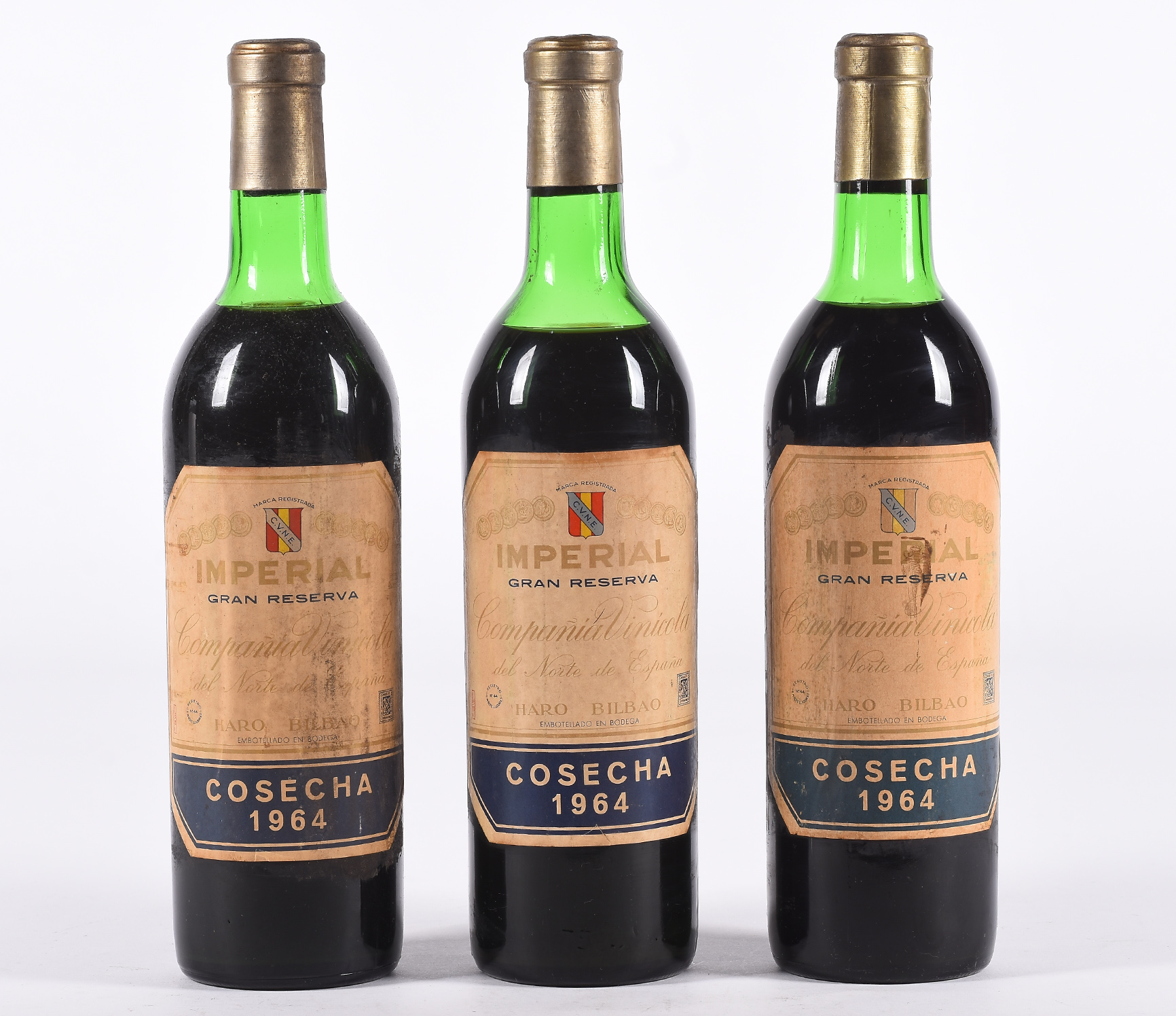 Lote compuesto por tres botellas de vino "Imperial", C.V.N.E. Gran Reserva, 1964. Etiquetas en buen estado.