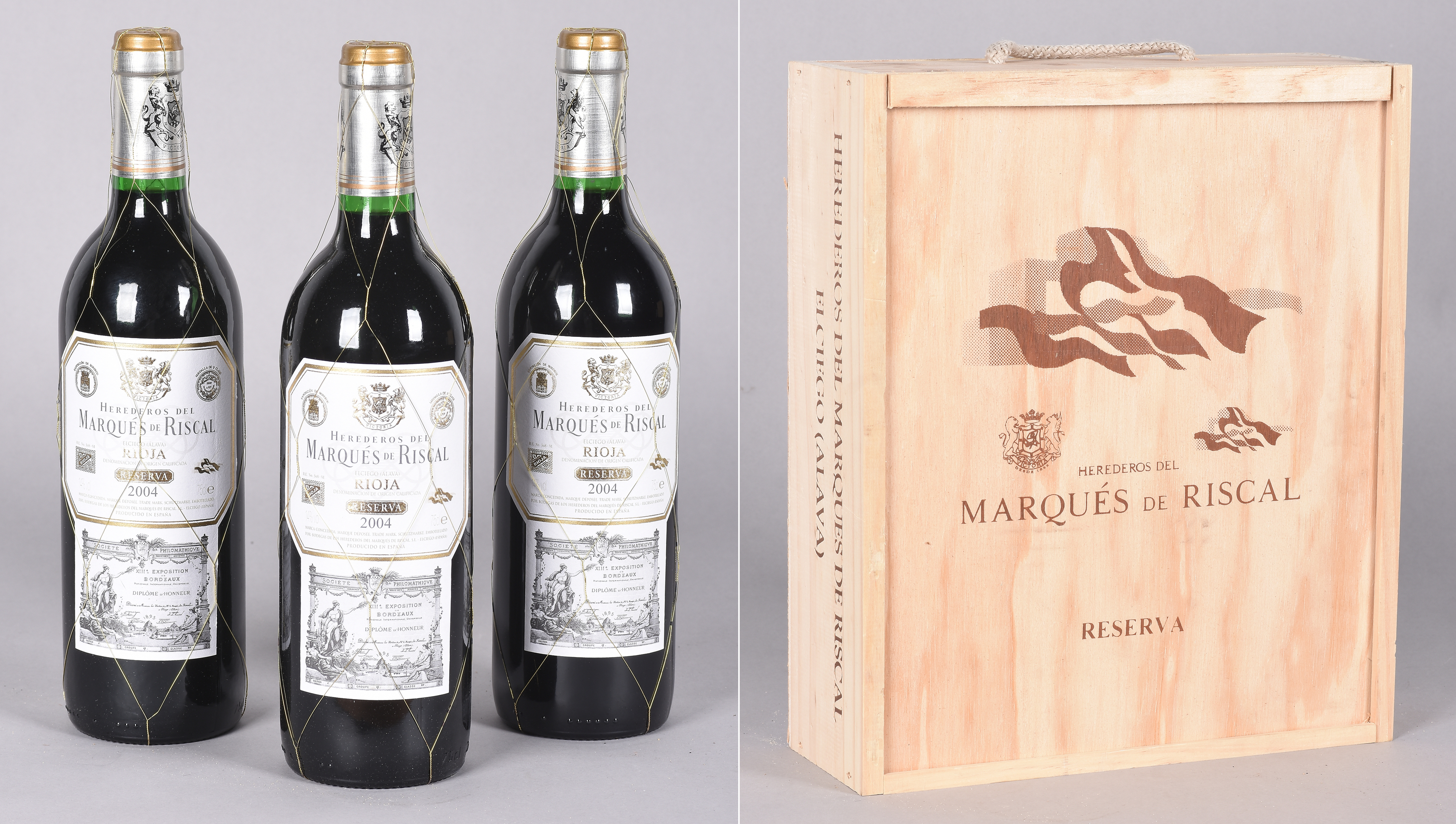 Lote compuesto por 3 botellas de vino de la Bodega MARQUÉS DE RISCAL, Reserva de 2004. Elciego, Álava, Rioja Alavesa. En su caja de madera original.