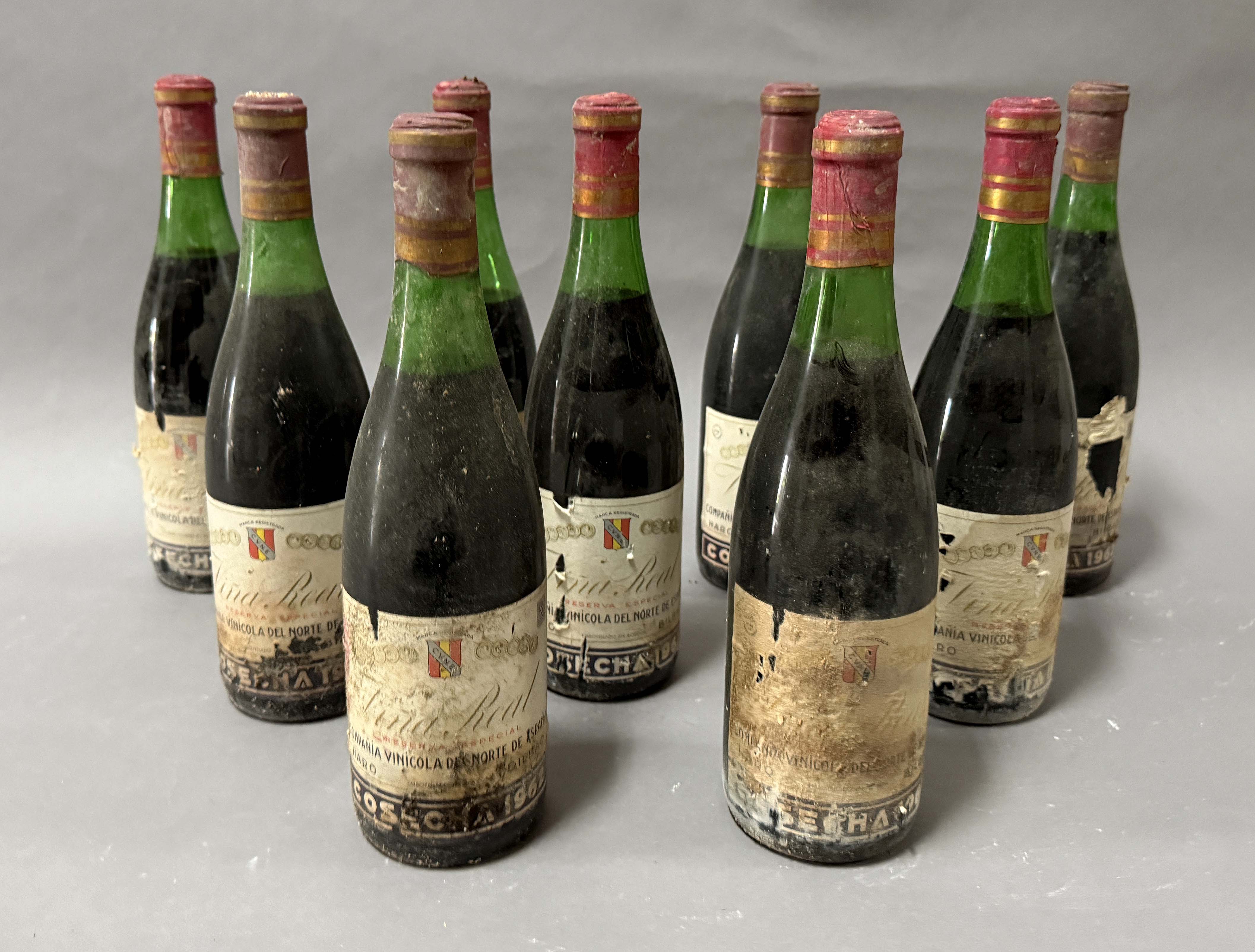 Lote compuesto por 9 botellas de la Bodega CVNE Viña Real reserva especial 1962. Haro La Rioja