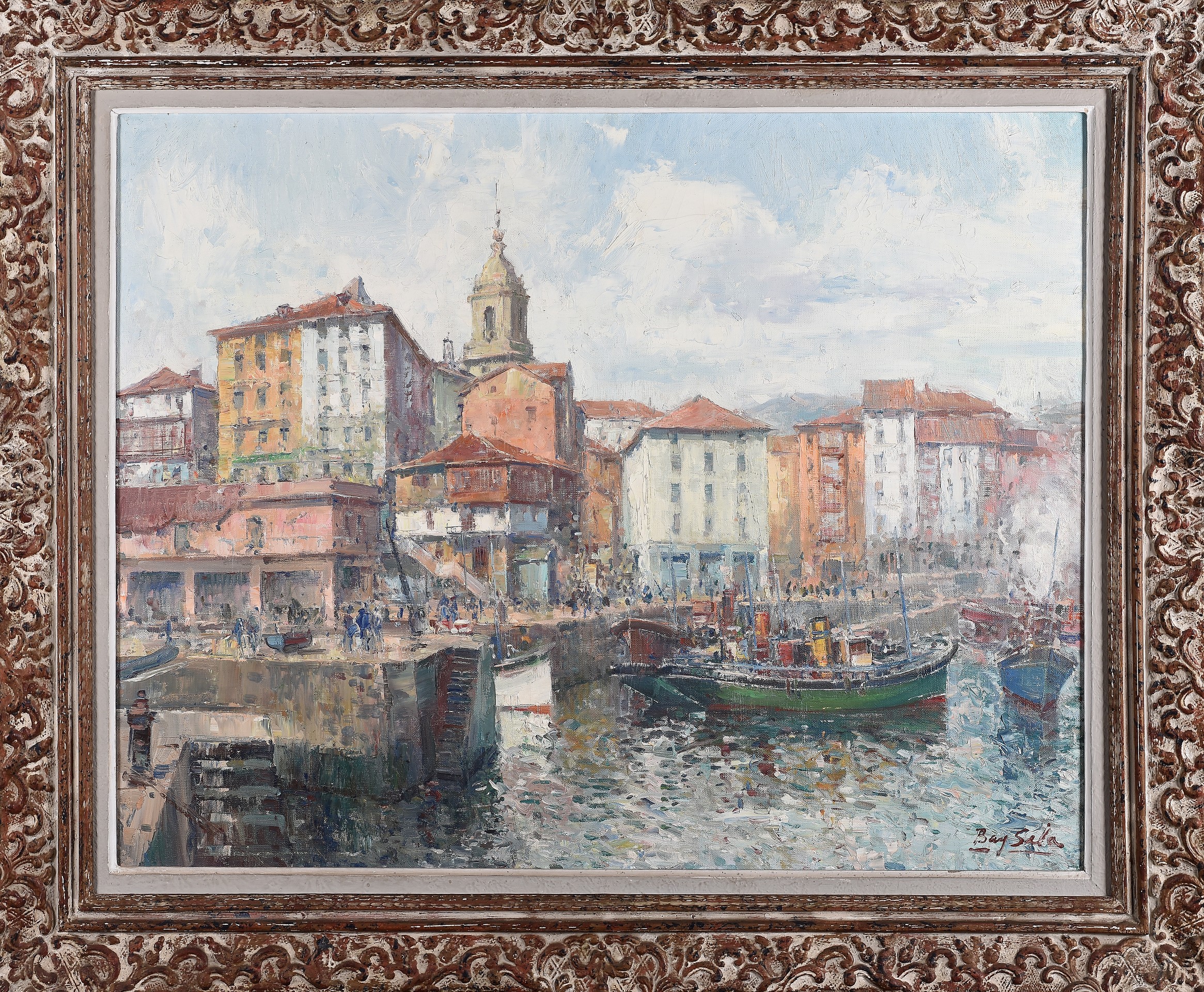 JUAN BAYÓN SALADO "BAY SALA"(Logroño, 1913 - Bilbao, 1995)"Puerto de Bermeo"Óleo sobre lienzo65 x 80 cm