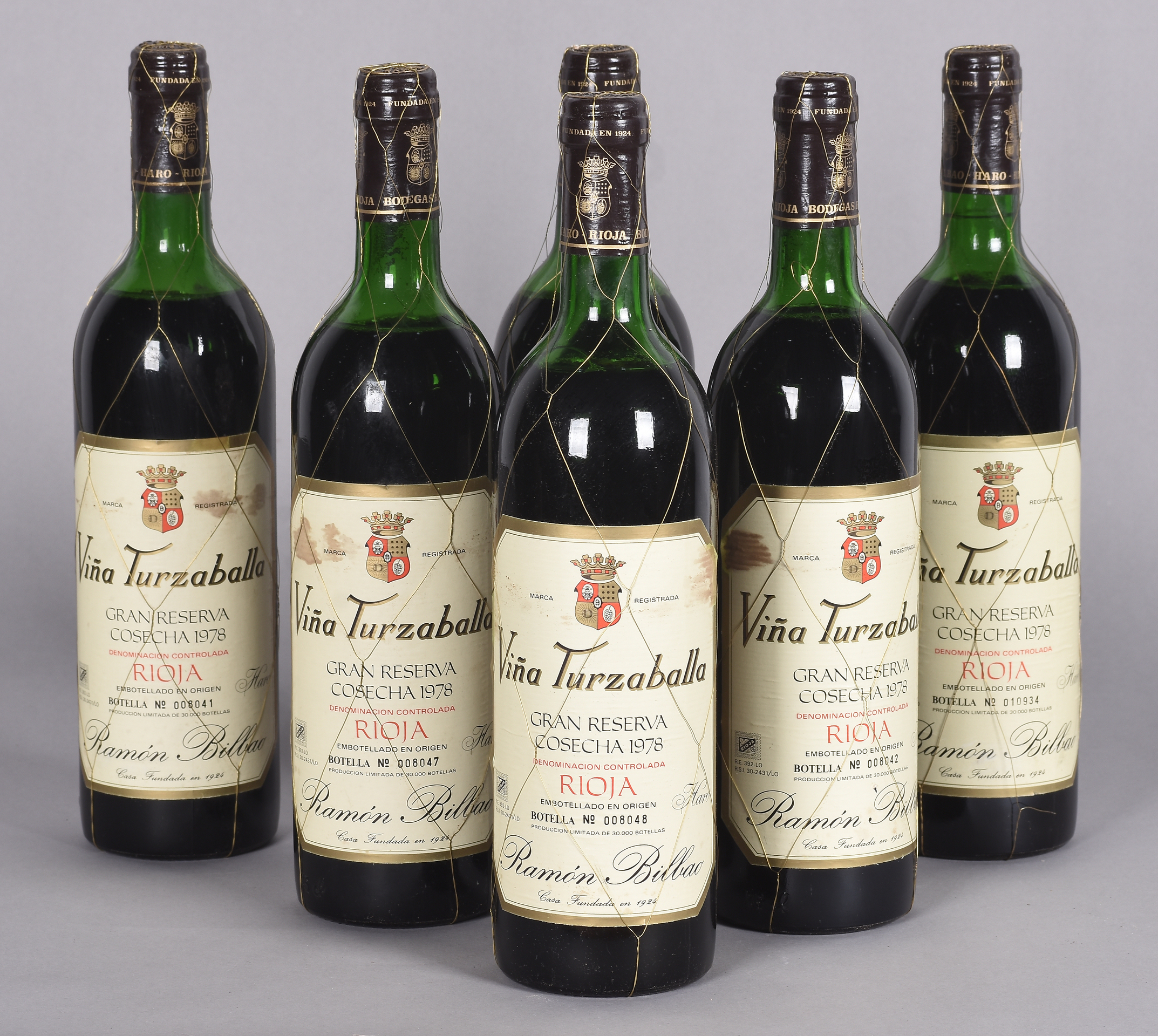 Lote compuesto por 6 botellas de vino tinto Bodegas Ramón Bilbao VIÑA TURZABALLA Gran Reserva 1978. En caja de madera Original. Haro La Rioja