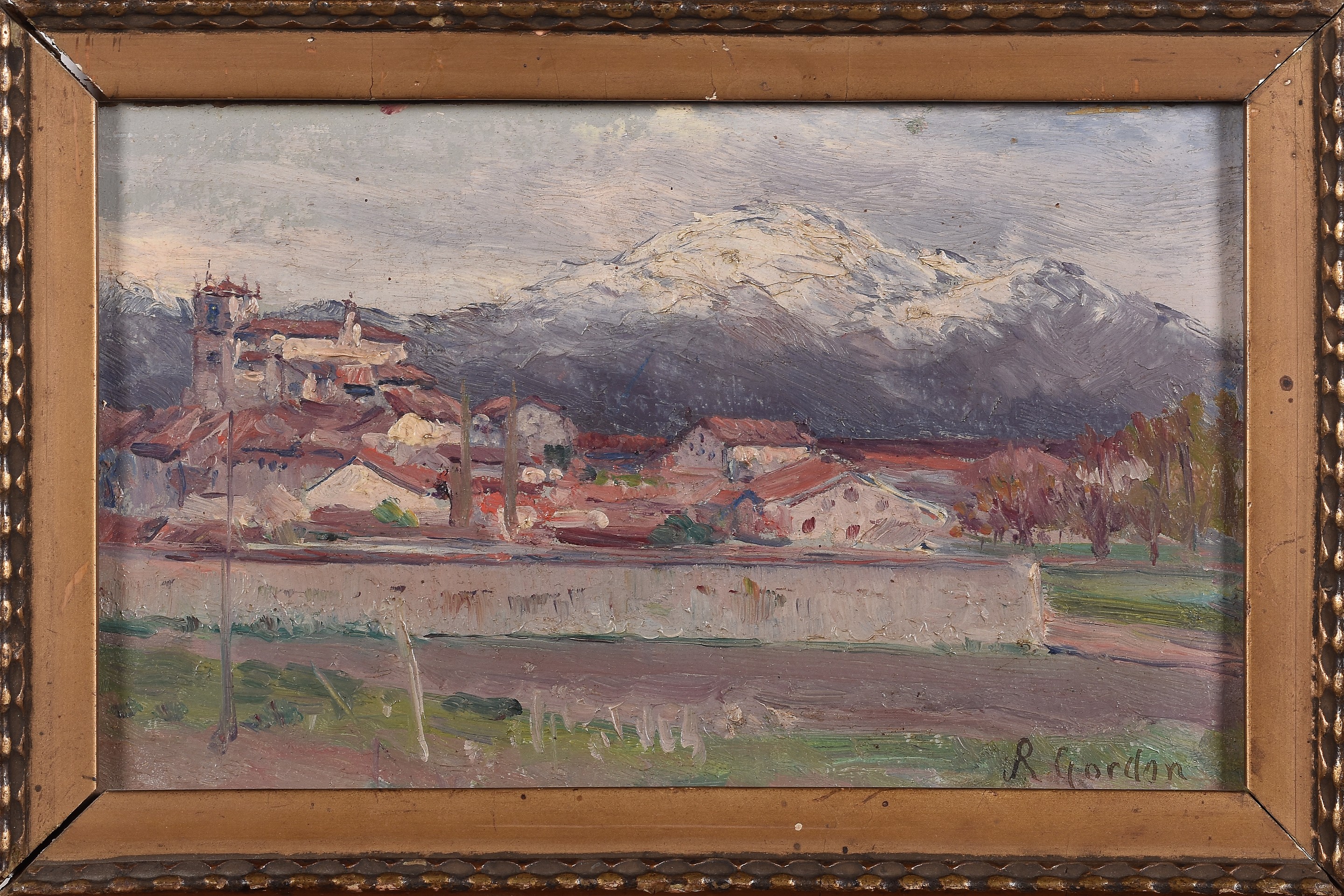 ROGELIO GORDÓN GARCÍA-ROVÉS(Oviedo, Asturias, 1860-San Sebastián, Gipuzkoa, 1938)"Paisaje vasco con monte nevado"Óleo sobre cartón10 x 16 cm