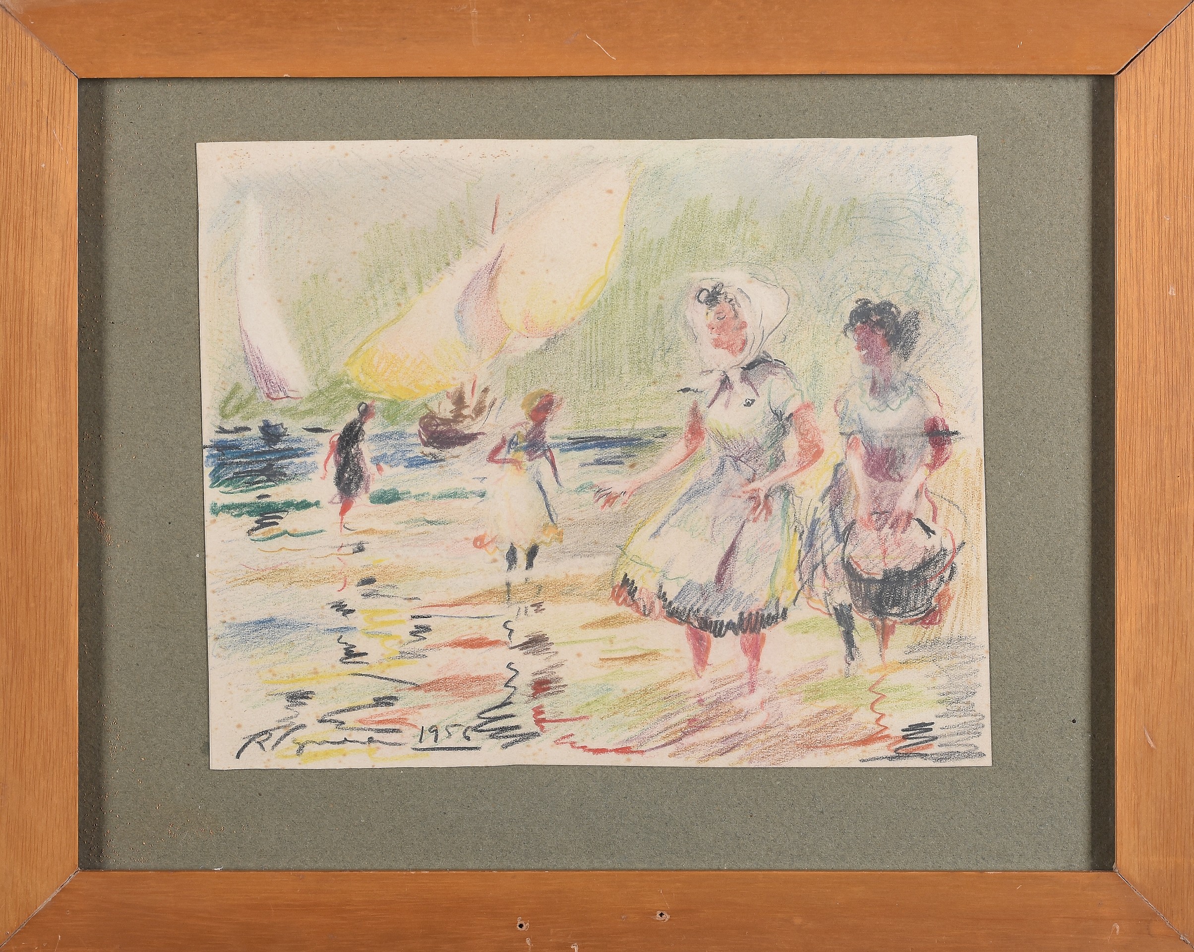 RAFAEL FIGUERA AYMERICH(Bilbao, 1907 - Málaga, 1987)"En la orilla"Lápices de colores sobre papel.17 x 22 cm