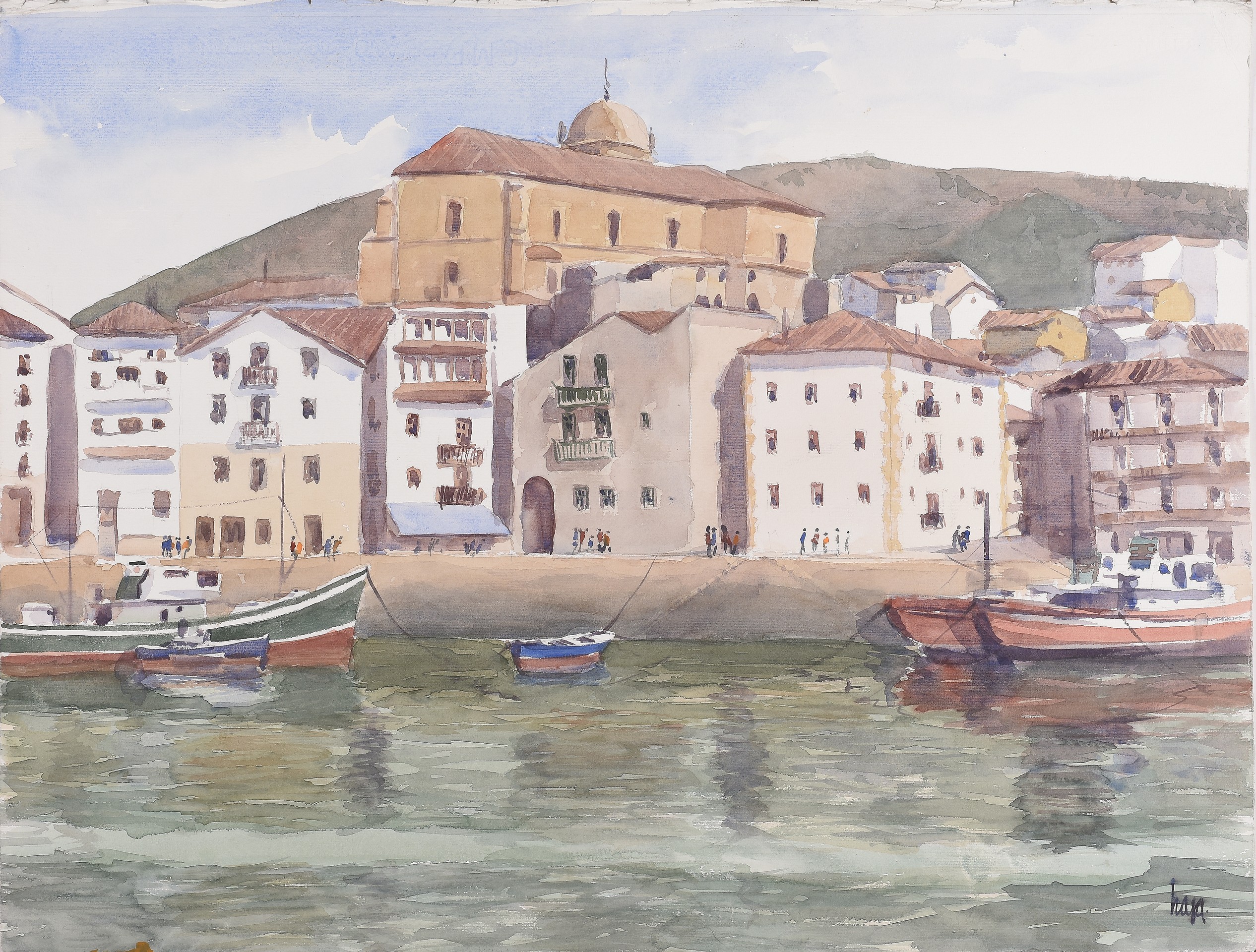 JAVIER LASA SANTILLÁN(Getxo, 1937)"Vista de pueblo pesquero"Acuarela sobre papel56 x 77 cm
