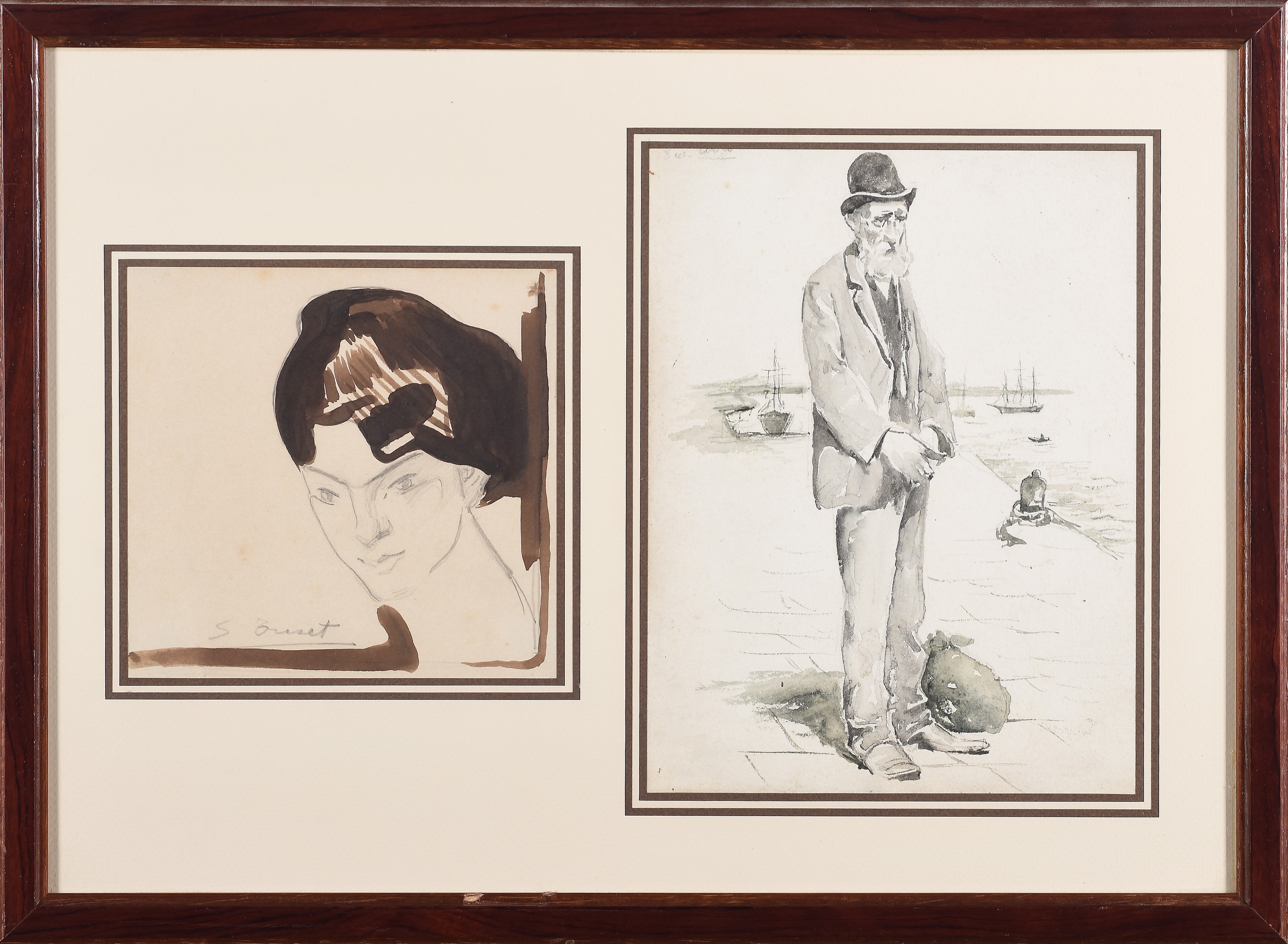 SALVADOR TUSET TUSET(Valencia, 1883-1951)Lote de dos dibujos: "Rostro de mujer" y "Hombre con hatillo"Técnica mixta sobre papel23 x 18 cm