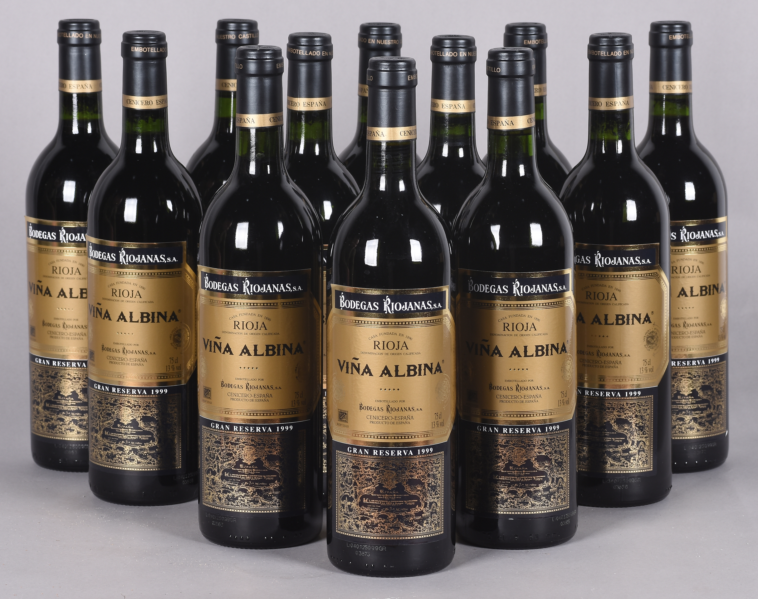Lote compuesto por 12 botellas de vino de la Bodega BODEGAS RIOJANAS. VIÑA ALBINA Gran Reserva de 1999. Cenicero, La Rioja.