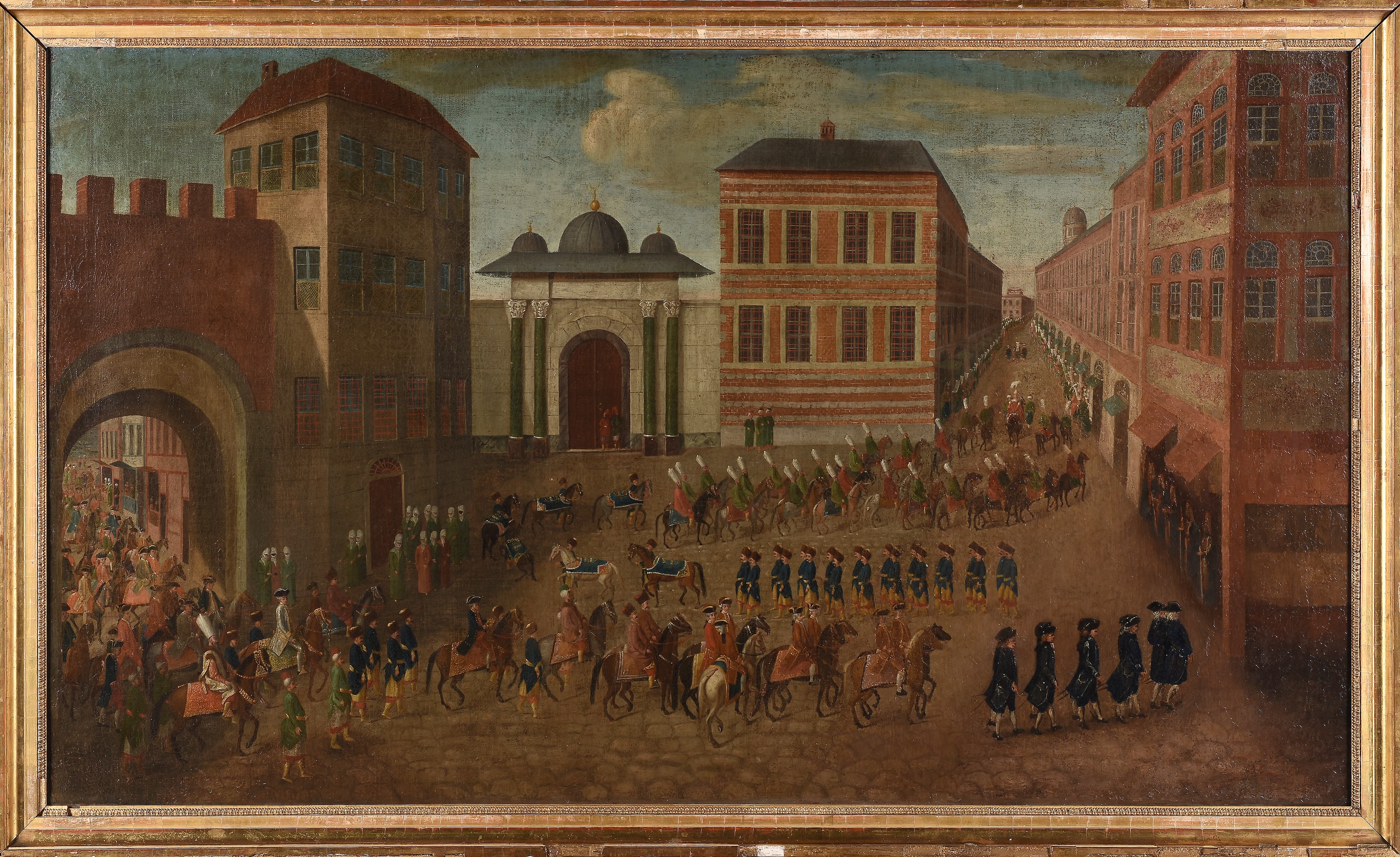 TALLER DE JEAN-BAPTISTE VAN MOUR O VANMOUR(Valenciennes, 1671-Estambul, 1737)"Recepción de diplomaticos en el PalacioTopkapi"Óleo sobre lienzo73 x 124 cm