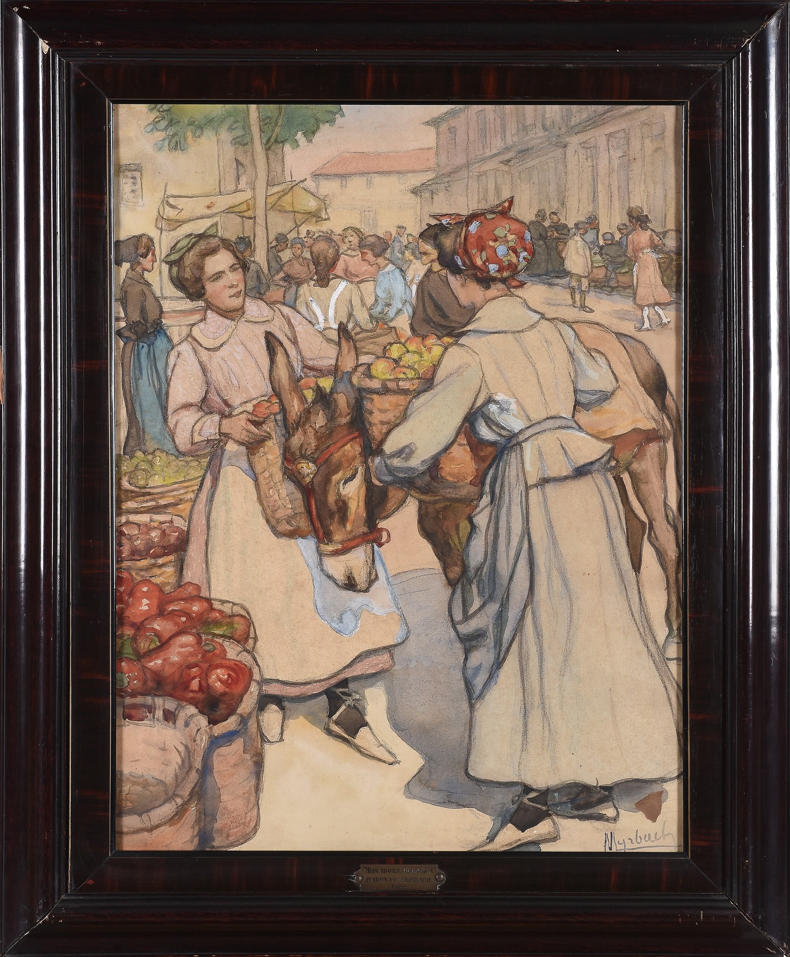 FELICIAN VON MYRBACH-RHEINFELD(Zalishchyky, Ucrania, 1853- Klagenfurt, Austria, 1940)"Escena de mercado"Carboncillo y acuarela sobre papel.62 x 48 cm