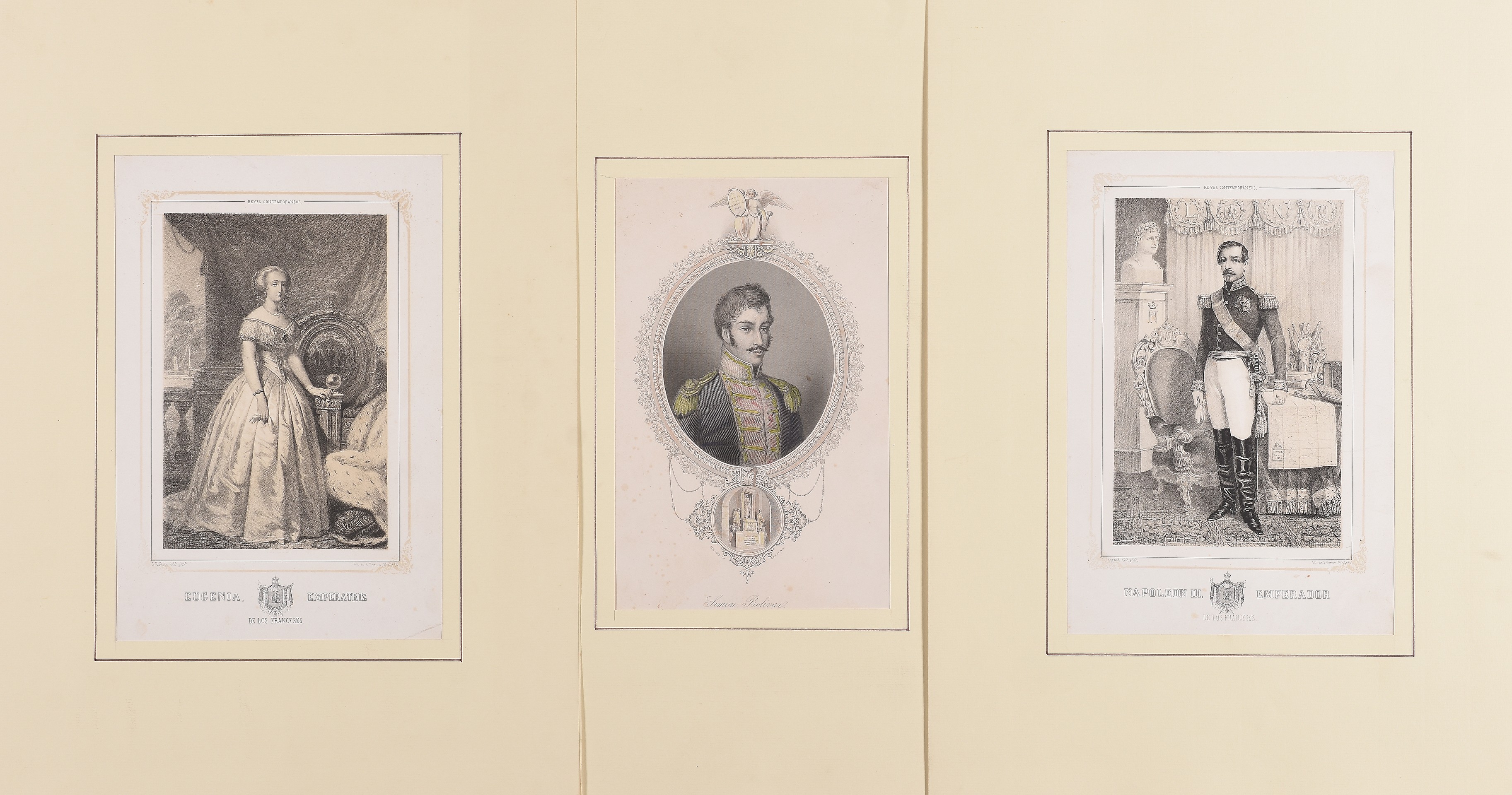 JULIO DONÓN(Madrid, S. XIX)"Eugenia, Emperatriz de los franceses", "Simón Bolívar" y "Napoleón III, Emperador de los franceses"Litografía28 x 20 cm