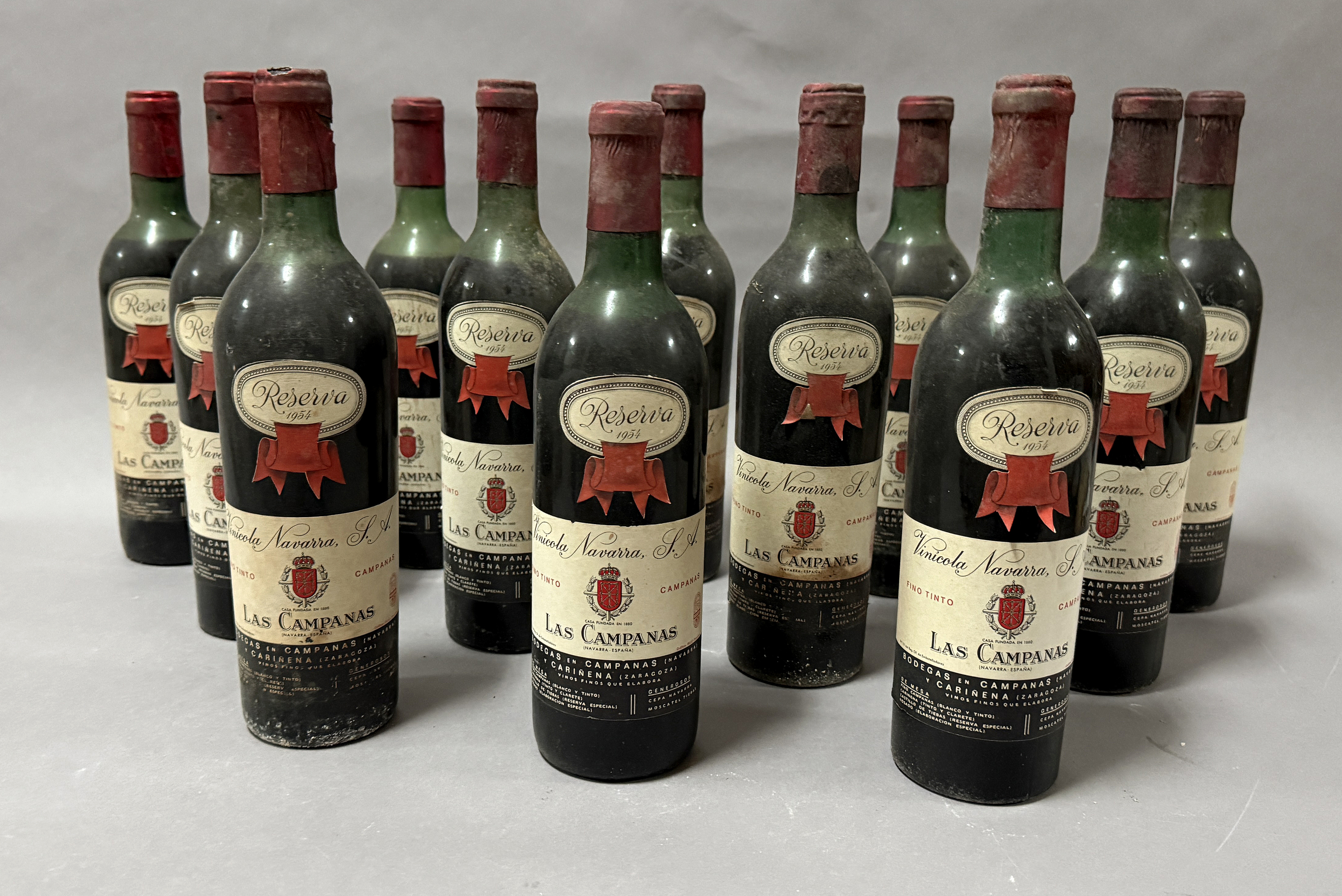 Lote compuesto por 12 botellas de vino tinto Bodegas Vinícola Navarra LAS CAMPANAS reserva 1954. Campanas Navarra