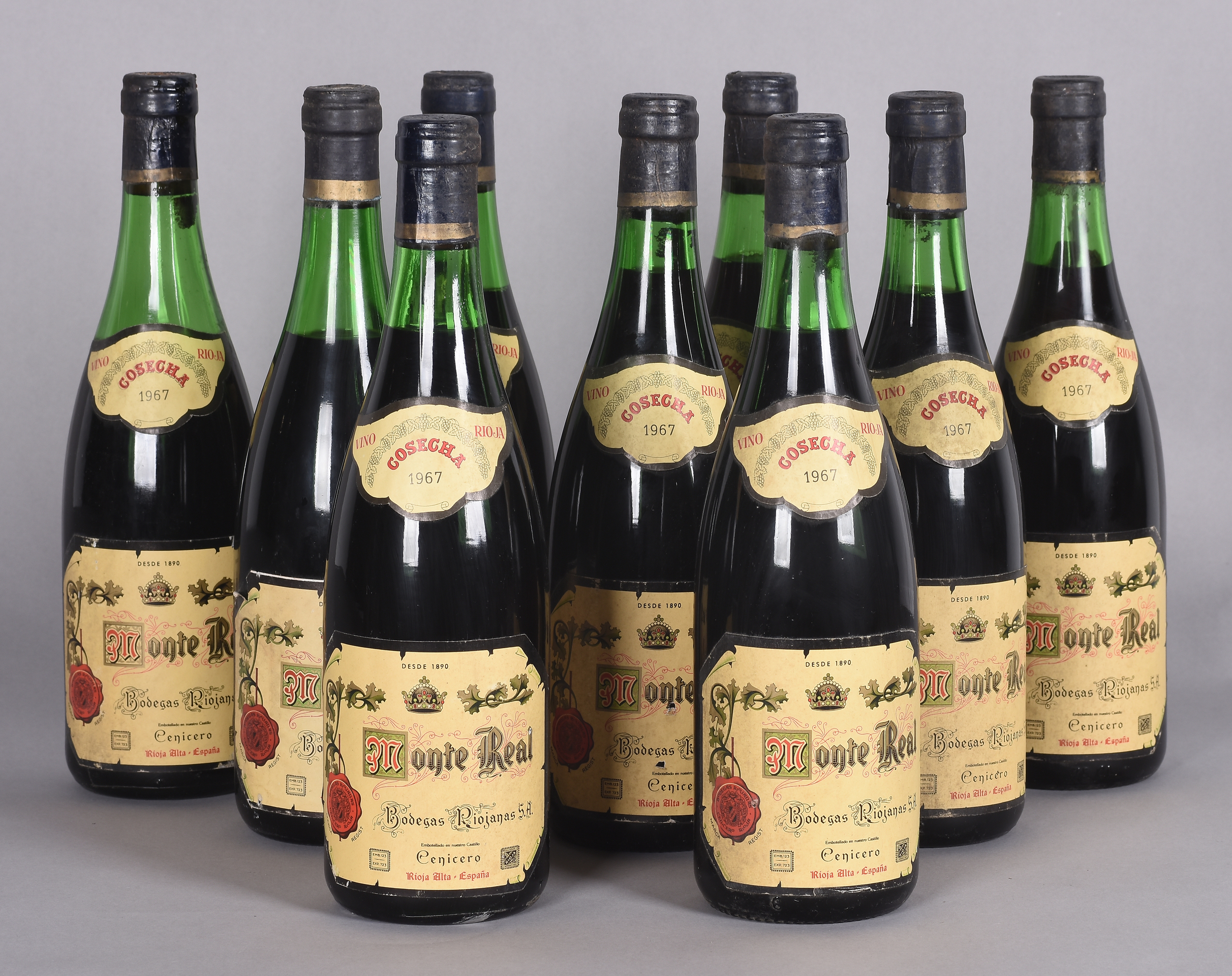 Lote compuesto por 9 botellas de vino tinto Bodegas Riojanas MONTE REAL 1967. Cenicero La Rioja