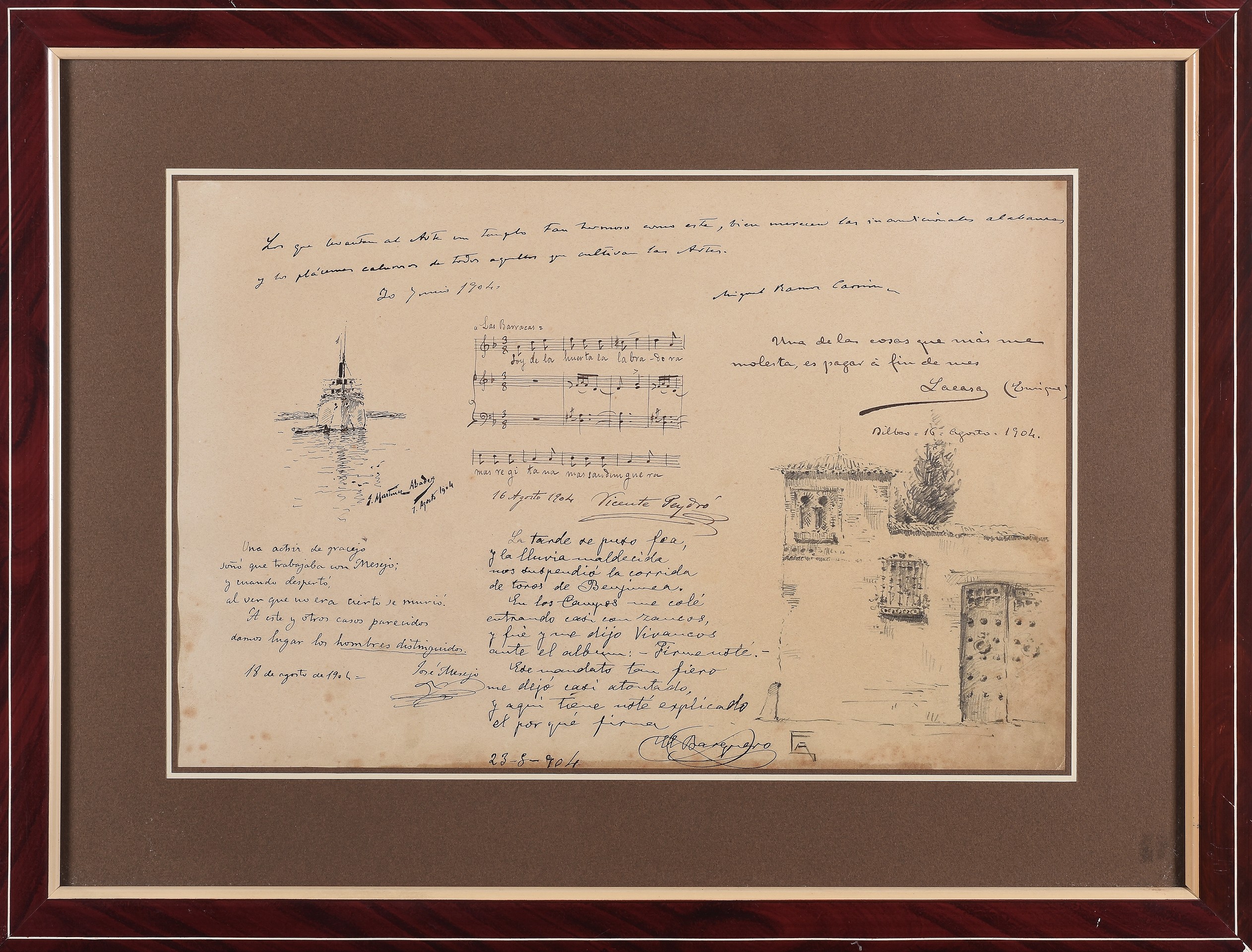 ESCUELA ESPAÑOLA(Principios S. XX)"Apuntes y dedicatorias firmadas por J. Martínez Abades, Vicente Peyró, Lacasa (Enrique), El Barquero, José Mesejo... en agosto de 1904"Tinta sobre papel26 x 42 cm