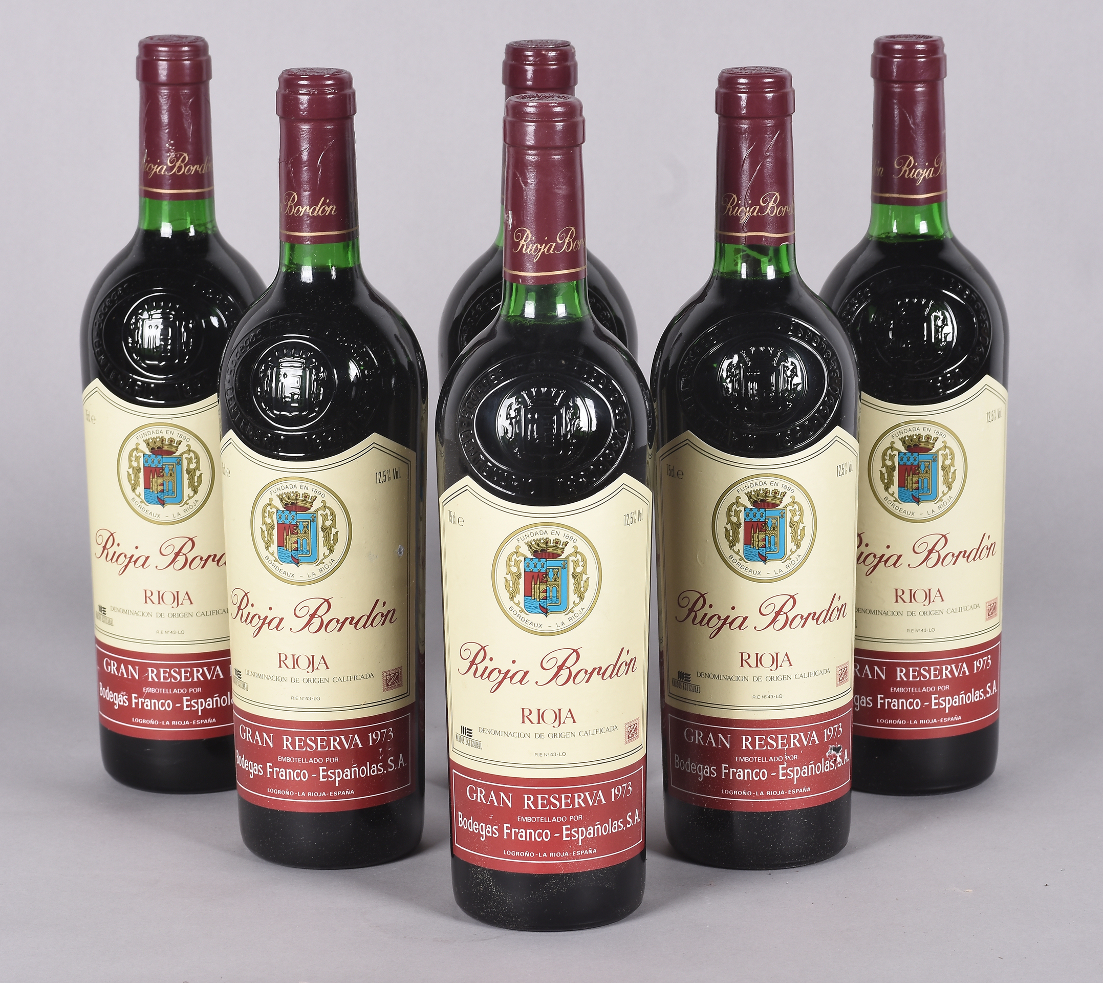 Lote compuesto por 6 botellas de vino de Bodegas FRANCO-ESPAÑOLAS. RIOJA BORDÓN, Gran Reserva 1973. Logroño, La Rioja.