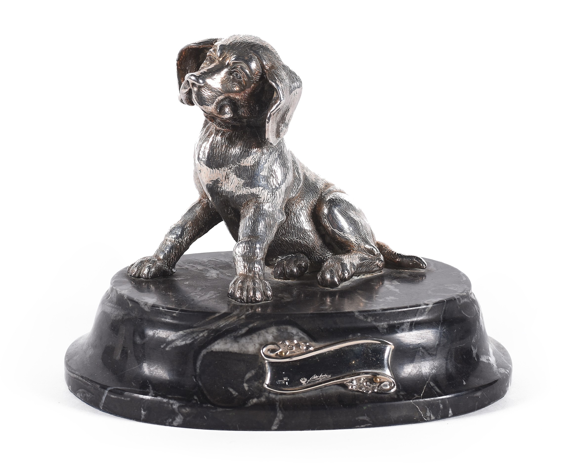 Figura realizada en resina bañada en plata con peana de mármol representando cachorro.