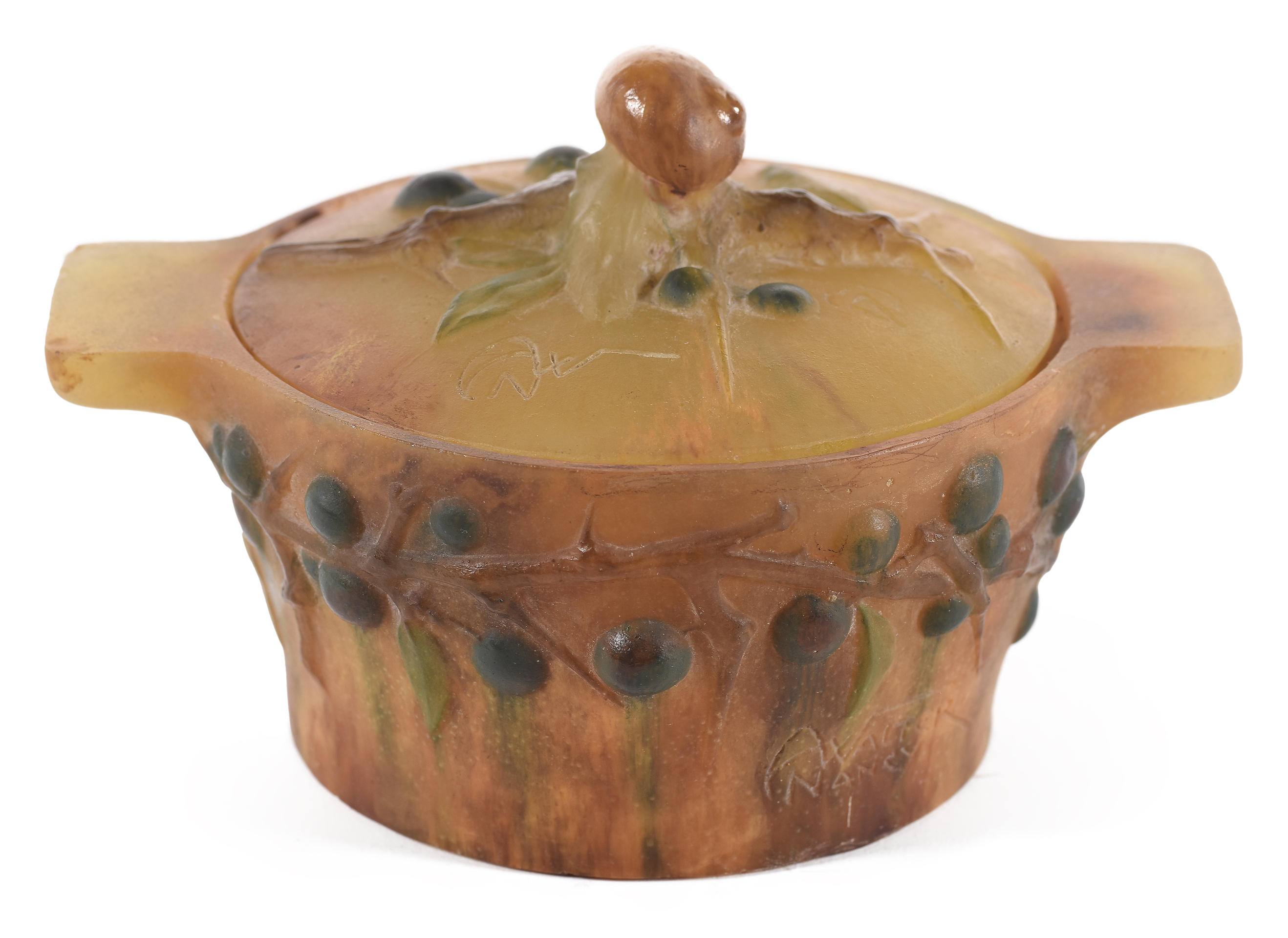 VÍCTOR AMALRIC WALTER(Sèvres, Francia, 1870-Lury sur Arnon, Francia, 1959)"Cazuelita con decoración de ramas de endrino y tapa con caracol"Cristal policromado10 x 17 x 14 cm