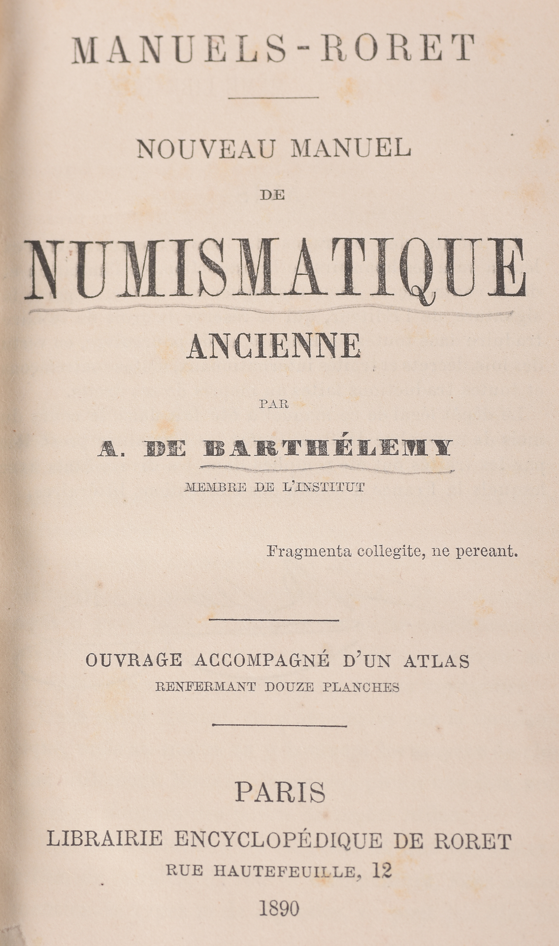 Libro "Manuels-Rorert. Nouveay manuel de numismatique ancienne par A. de Barthélemy, membrede L'institu". Ouvrage accompgné d'un atlas. Librarie Encyclopédique de Roret. París, 1890.