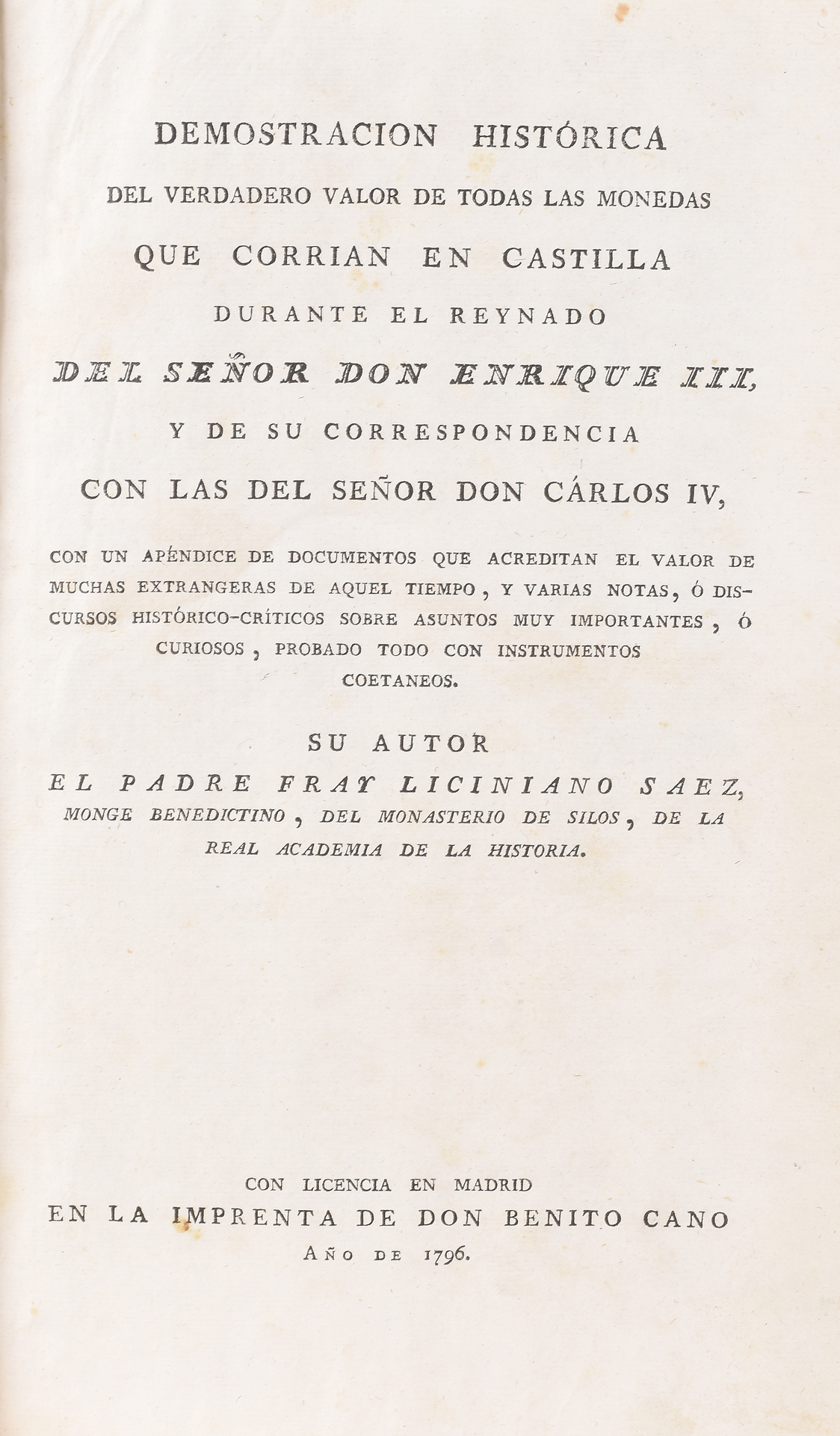 Libro "Demostración histórica del verdadero valor de todas las monedas que corrían en Castilla durante el reynado del señor Don Enrique IV, y de su correspondencia con las del Señor D. Carlos IV. Con un apéndice de instrumentos que justifican el valor de las mismas: noticia de los precios de los granos, carnes, pescados, jornales de labradores y artistas en aquel tiempo, y su equivalencia a las monedas actuales; y algunos otros documentos útiles; y algunos otros documentos útiles curiosos". Su autor el padre Fray Liciniano Saez, monge benedictino del Monasterio de Santo Domingo de Silos, y académico de número de la Real Academia de la Historia. Publica la misma Real Academia. Con licencia en Madrid en la Imprenta de Sancha. Año de 1805.
