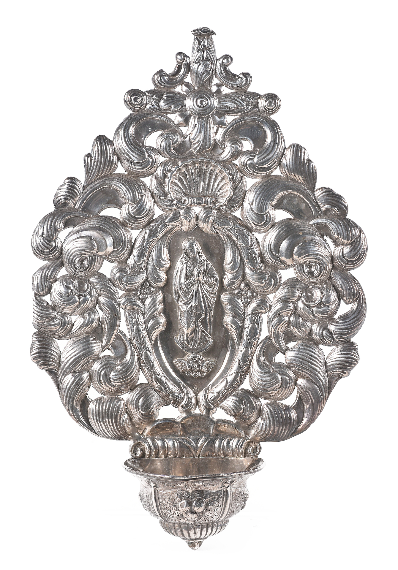 Agua benditera realizada en plata representando "Inmaculada Concepción".