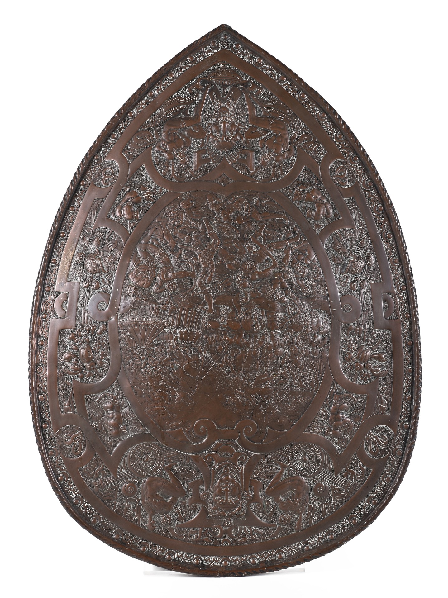 Escudo realizado en cobre representando "Escenas de batallas".