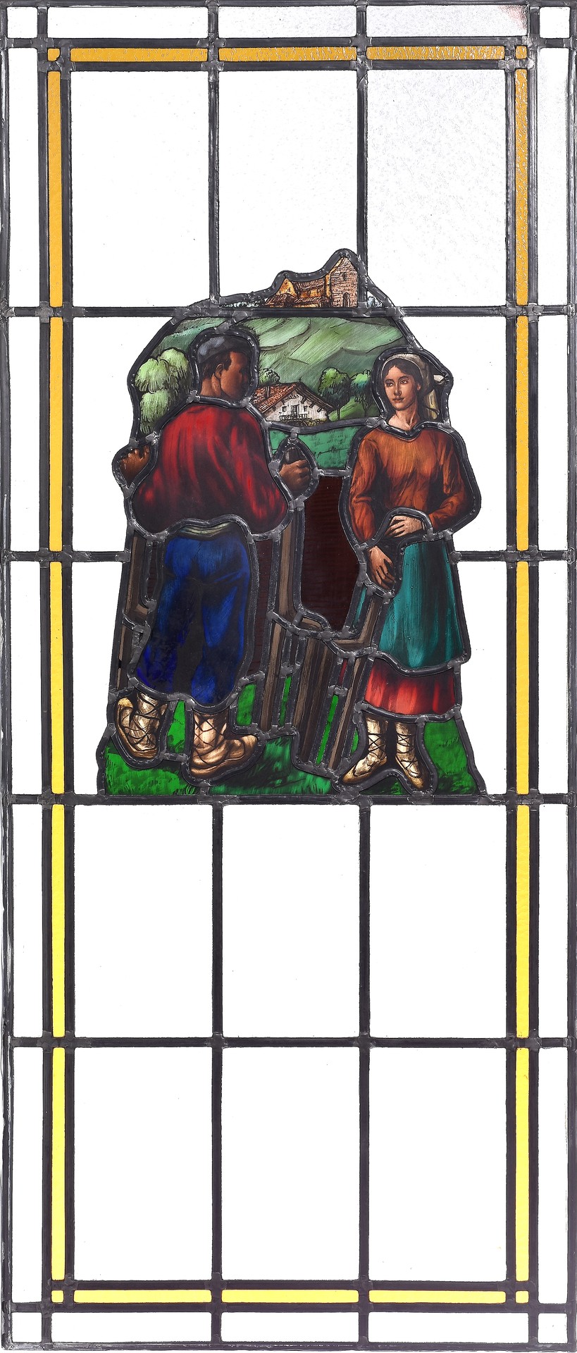 Vidriera realizada en cristal emplomado representando "Pareja de layadores vascos".