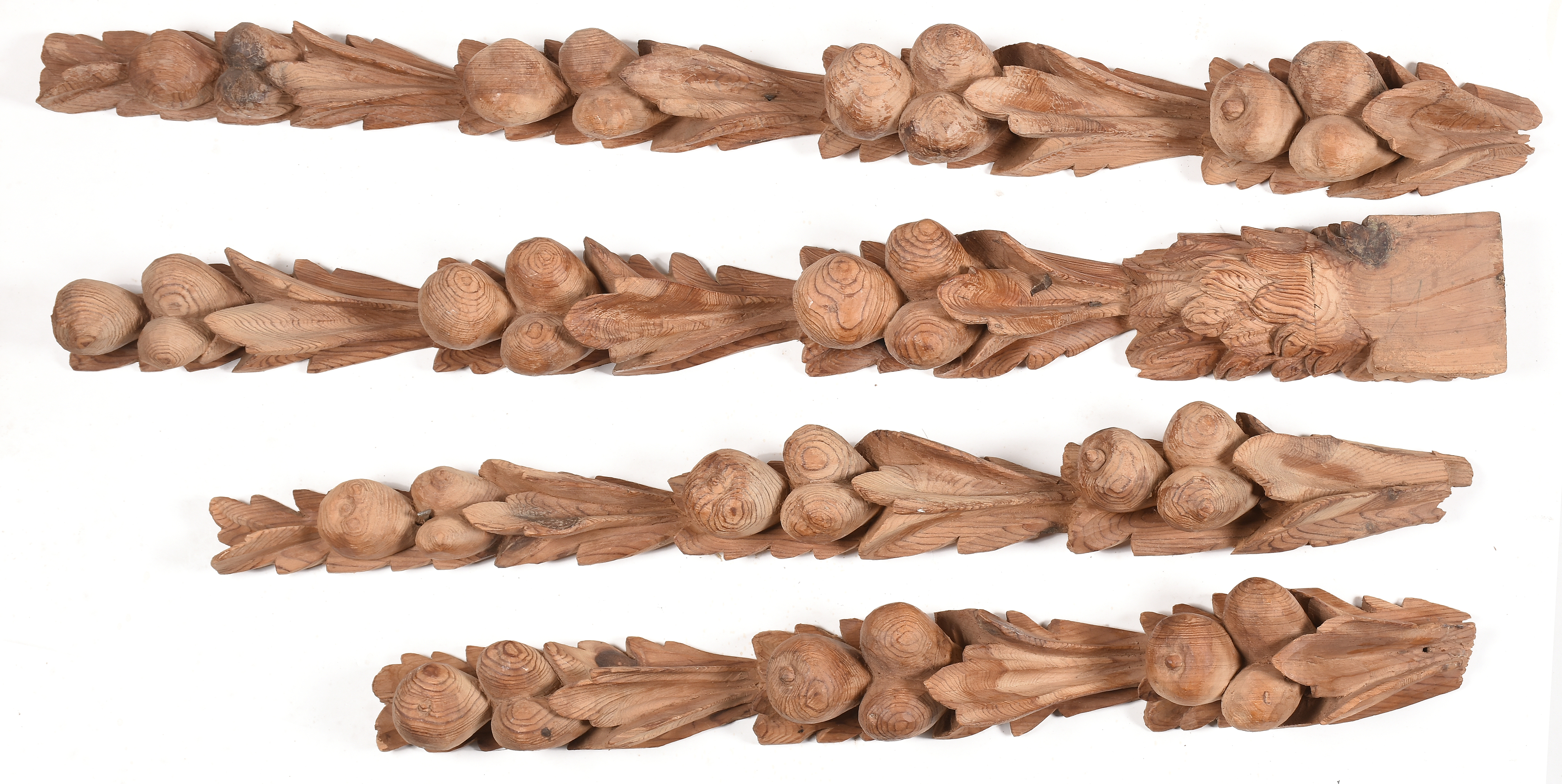Lote compuesto por cuatro guirnaldas realizadas en madera de pino tallada.