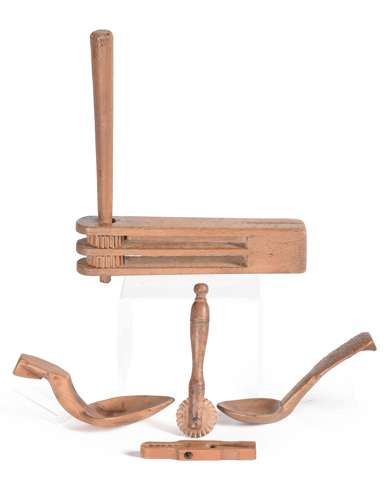 Lote compuesto por cinco piezas karraka, pinza, dos cucharas y un marcador de repostería realizadas en madera.