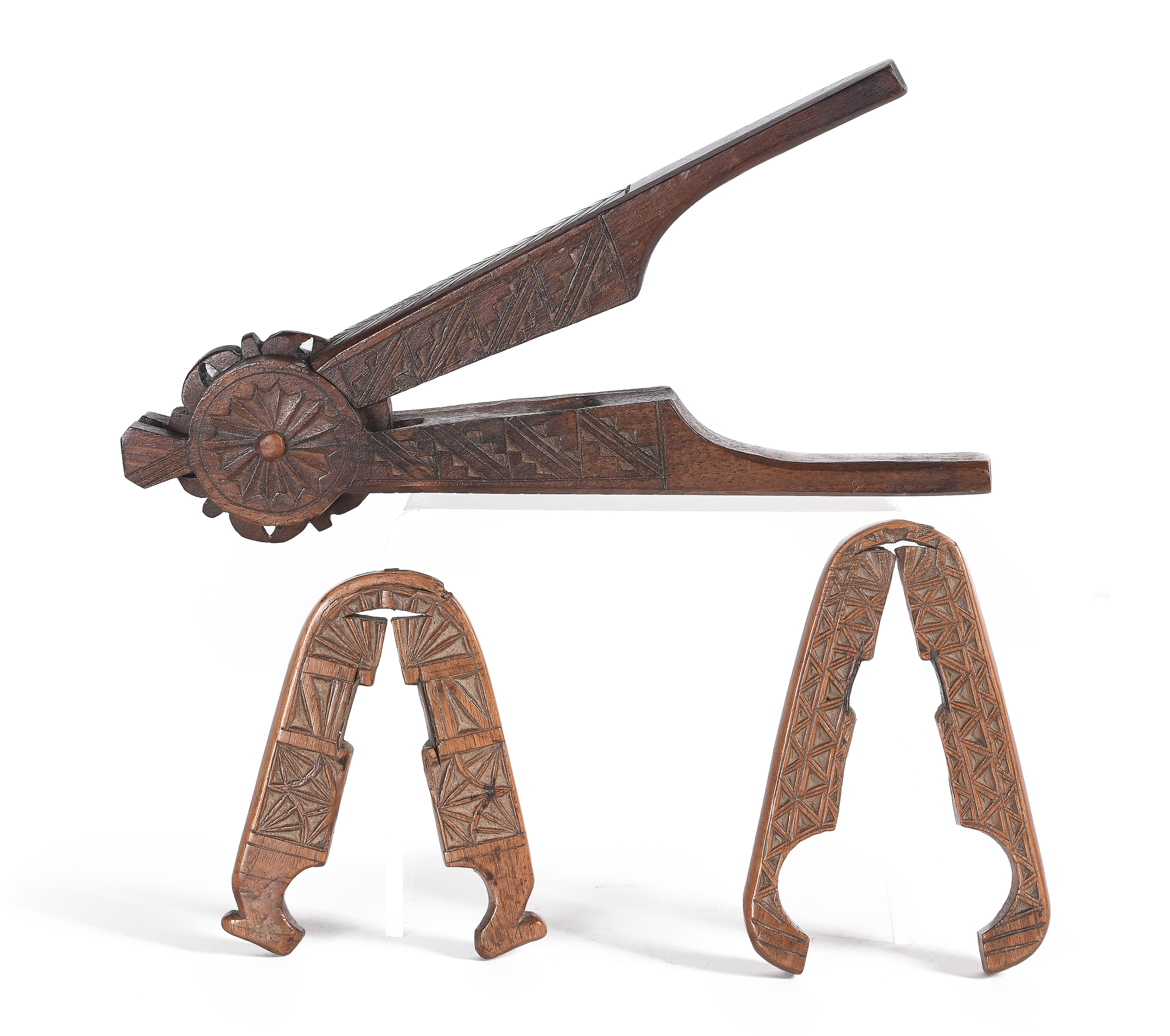 Lote compuesto por tres cascapiñones realizados en madera tallada. Trabajo pastoril.