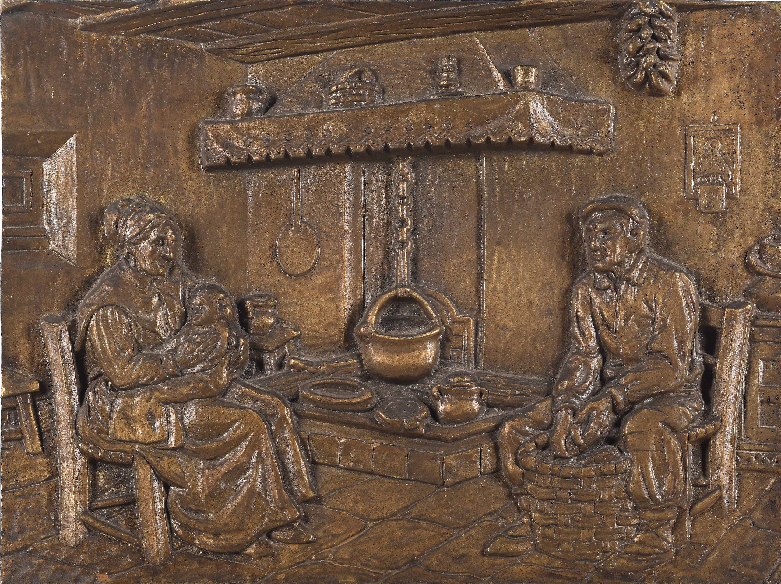 Relieve realizado en bronce representando "Interior de cocina con personajes vascos"