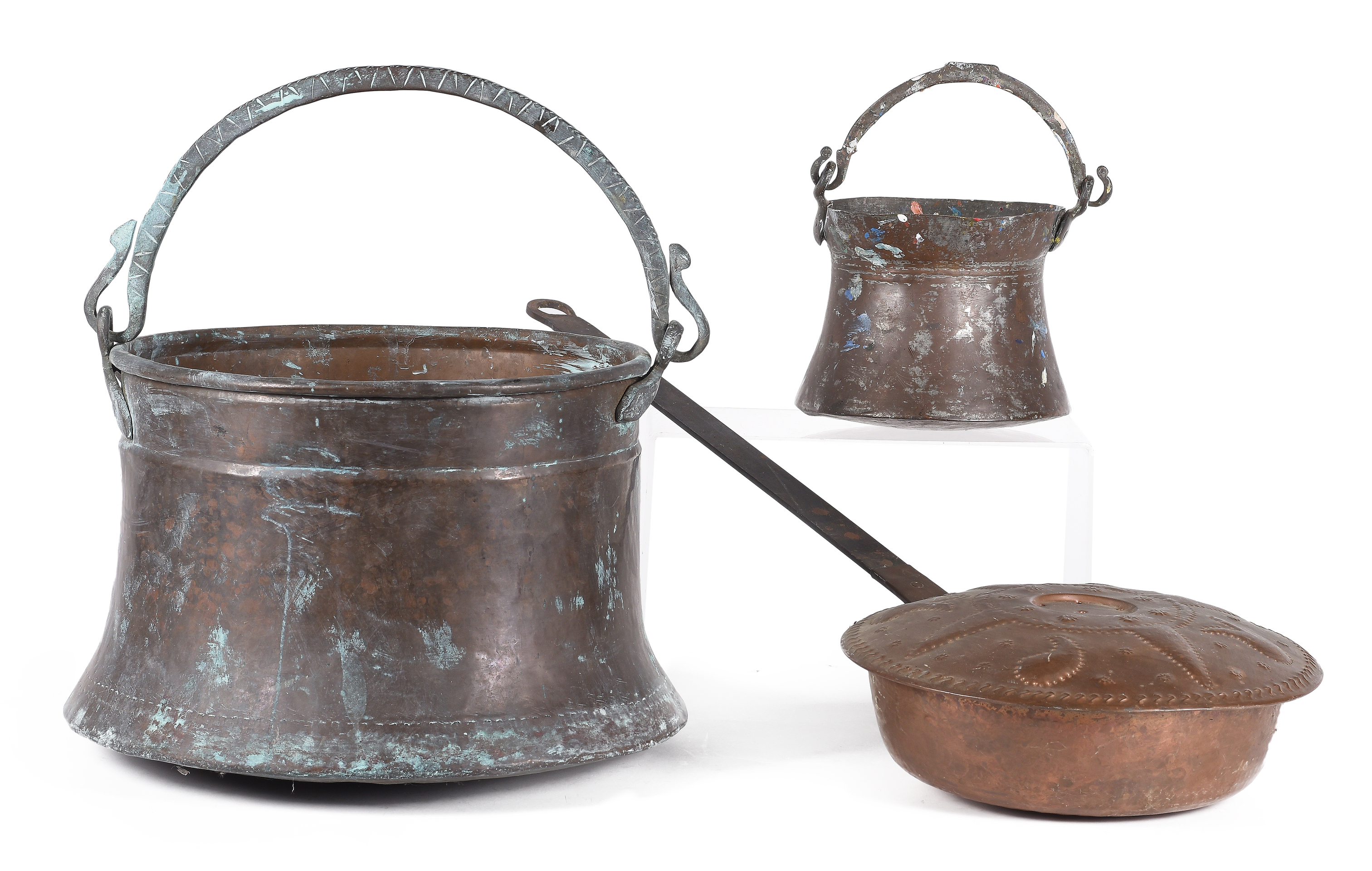 Lote compuesto por un calienta-camas y dos calderos realizados en cobre.