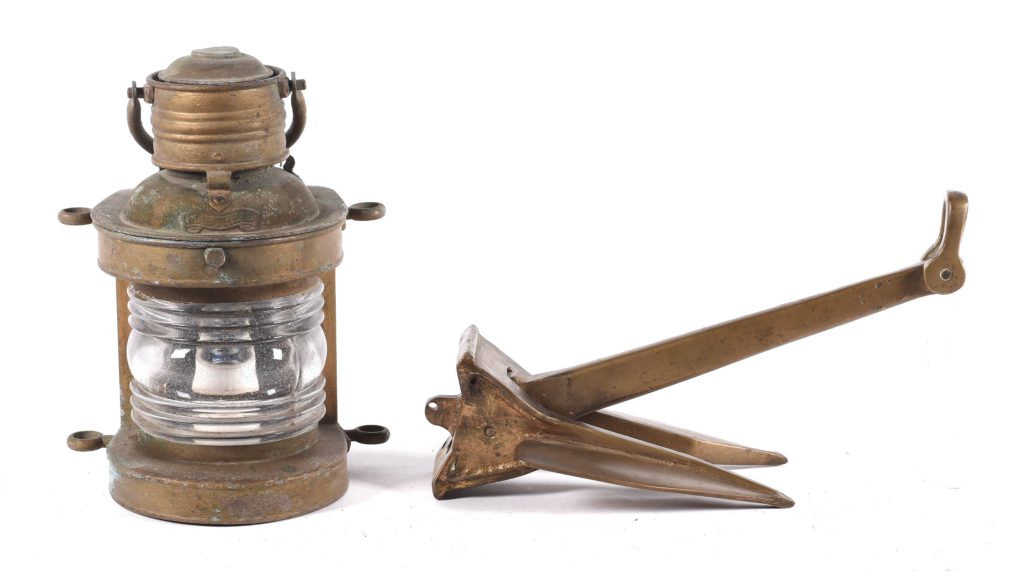 Lote compuesto farol y ancla de barco realizados en bronce.