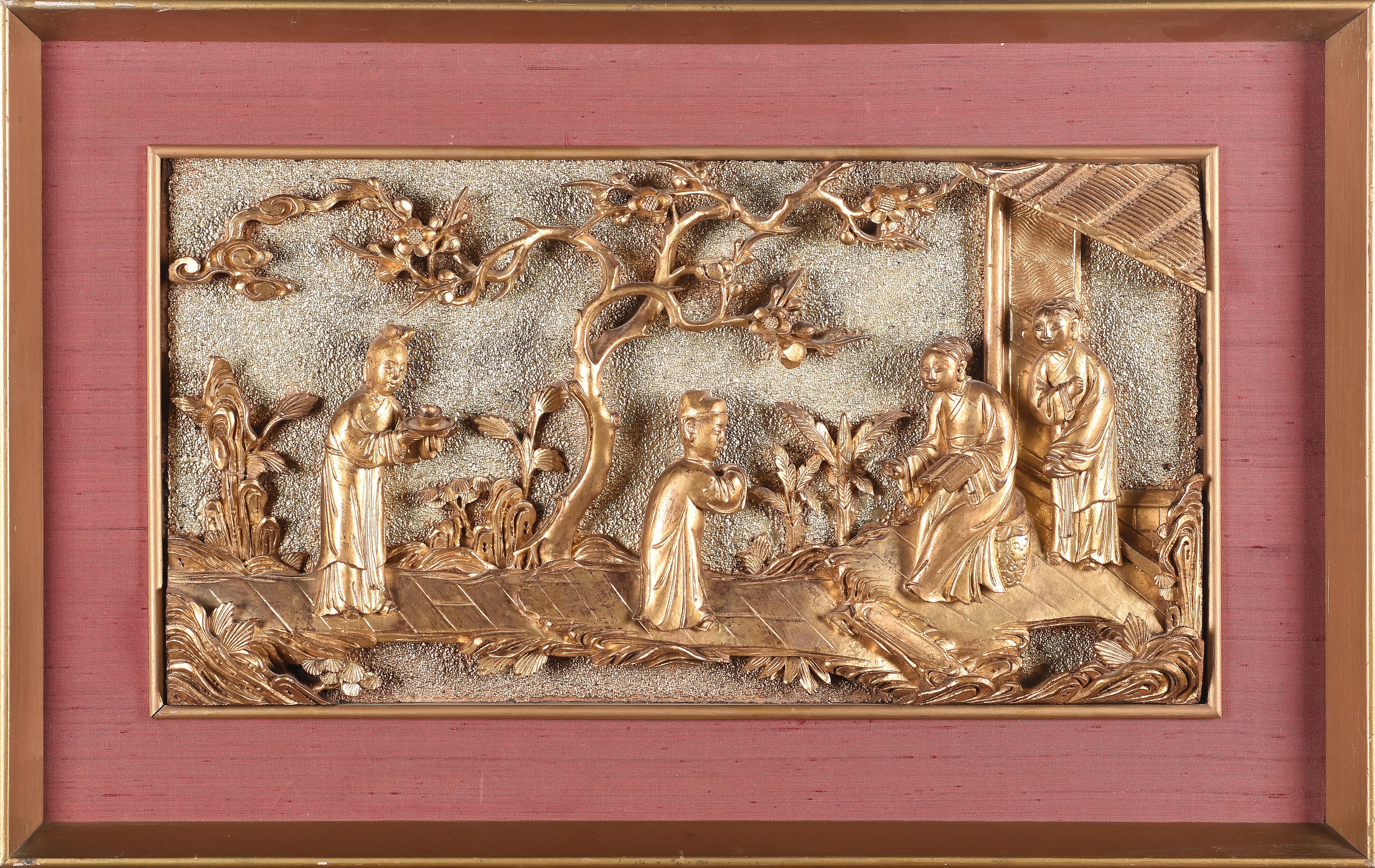 Bajo relieve realizado en madera tallada y dorada con motivos orientales.
