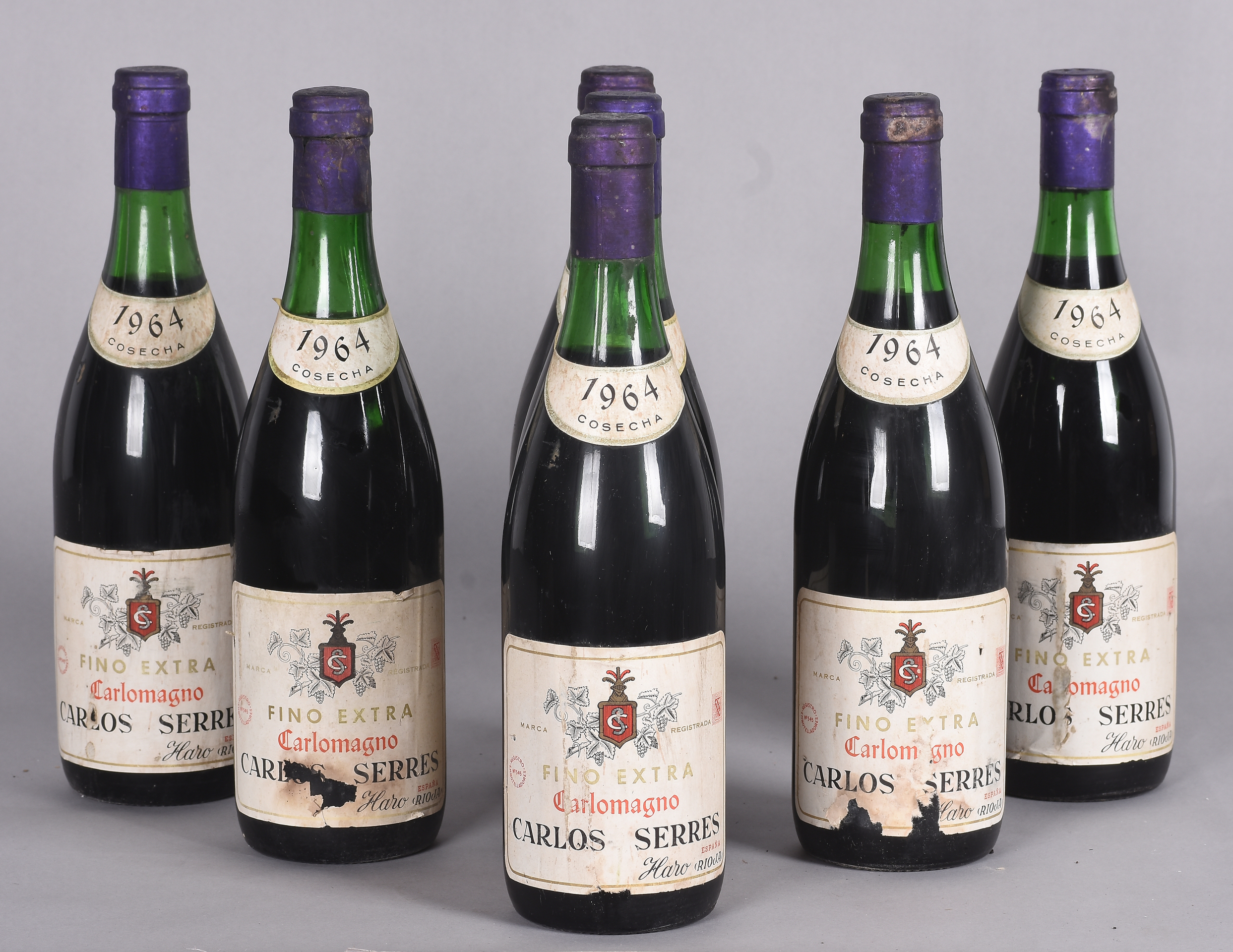 Lote compuesto por 7 botellas de vino tinto Bodegas Carlos Serres Fino Extra CARLOMAGNO Crianza 1964.
