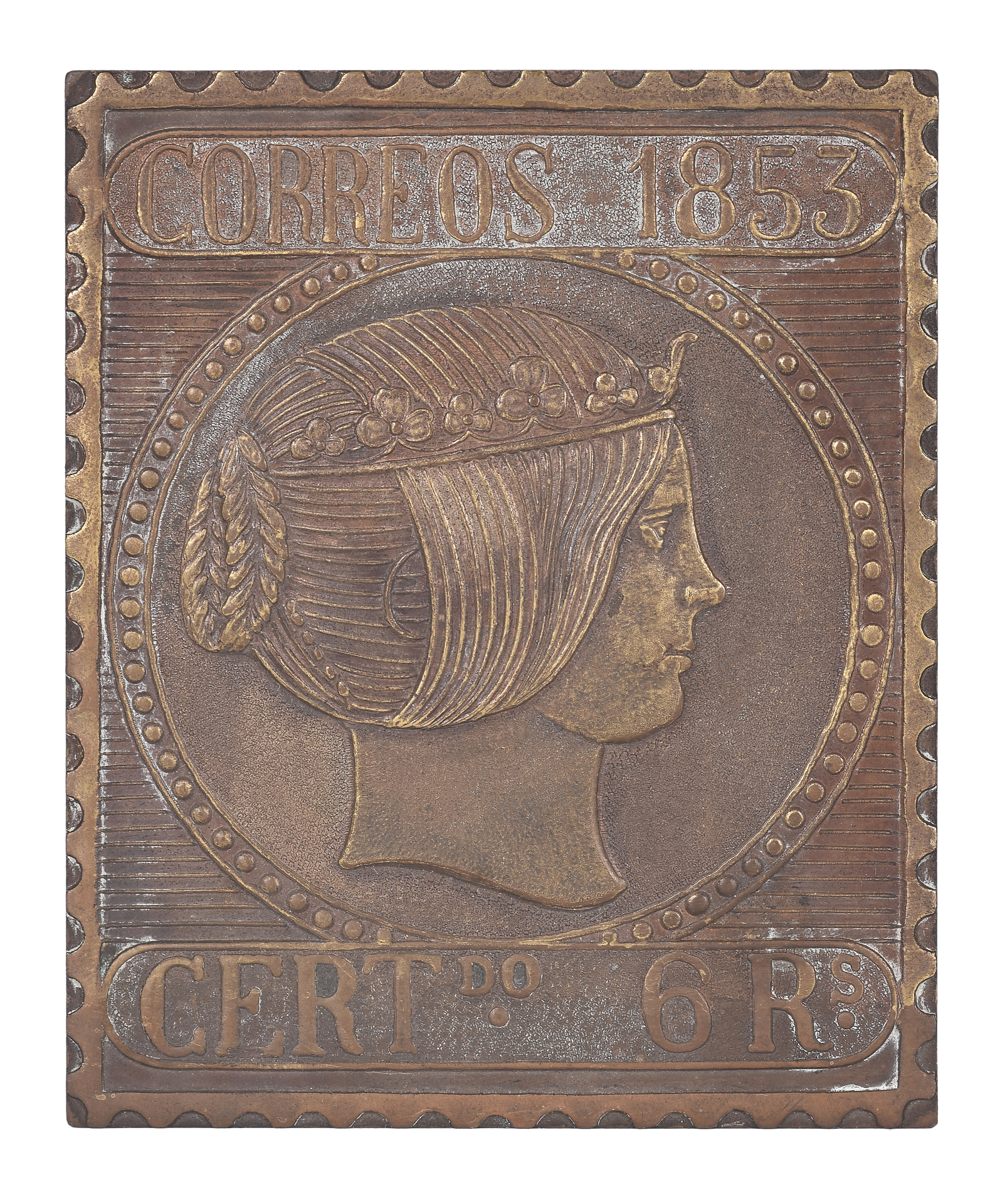Placa realizada en bronce representando un sello de correos de Isabel II de 1853