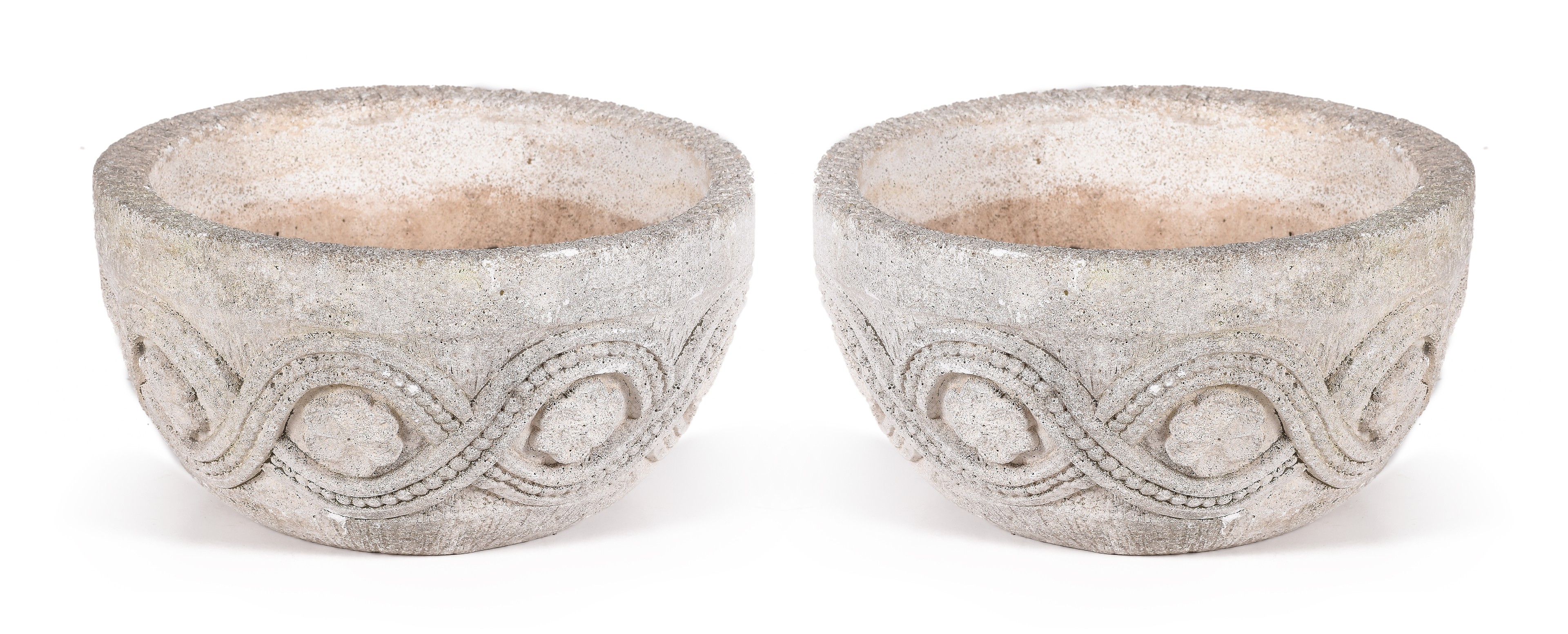 Lote compuesto por dos maceteros de jardín realizados en piedra con decoración geométrica.