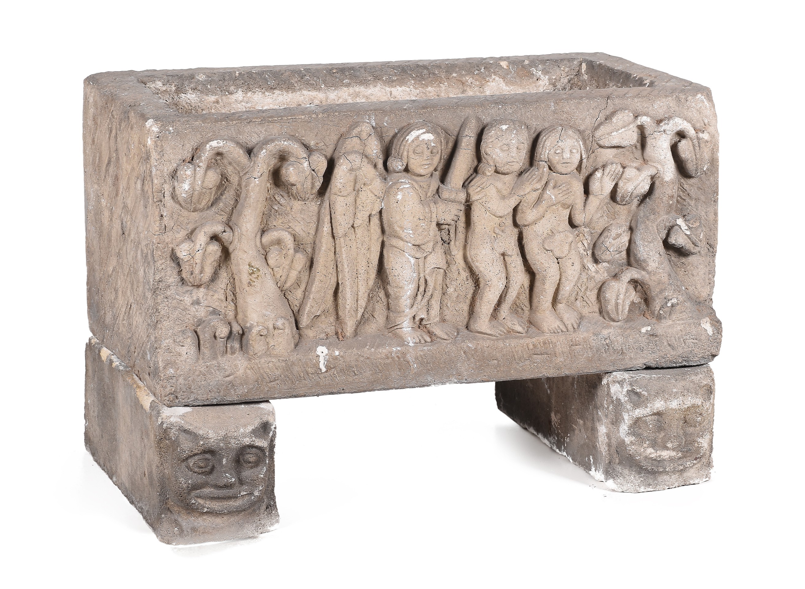Macetero realizado en piedra representando "Adán y Eva expulsados del Paraíso".
