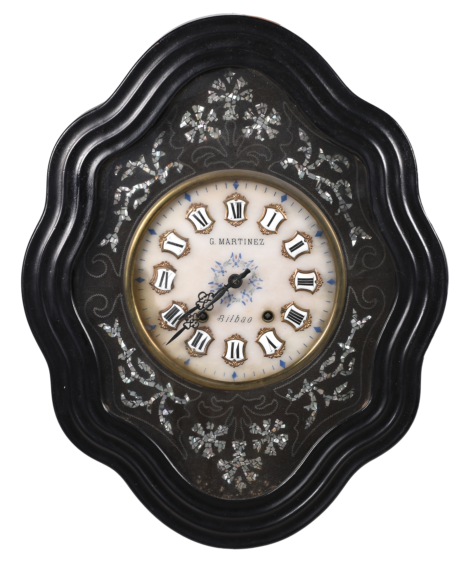 Reloj de ojo de buey realizado en madera ebonizada y marquetería de nácar con esfera de alabastro y la numeración de porcelana. G. Martinez Bilbao. Época Napoleón III