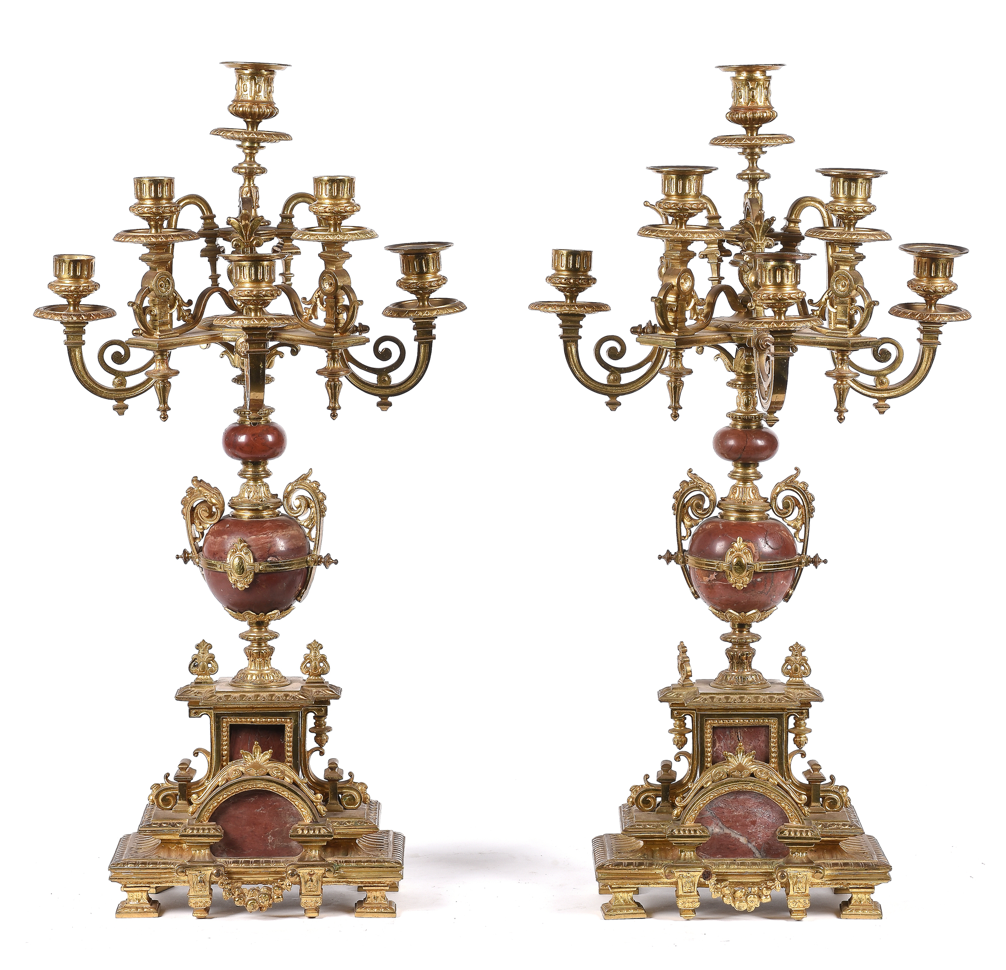 Pareja de candelabros realizados en bronce dorado y mármol. Francia. Época Napoleón III
