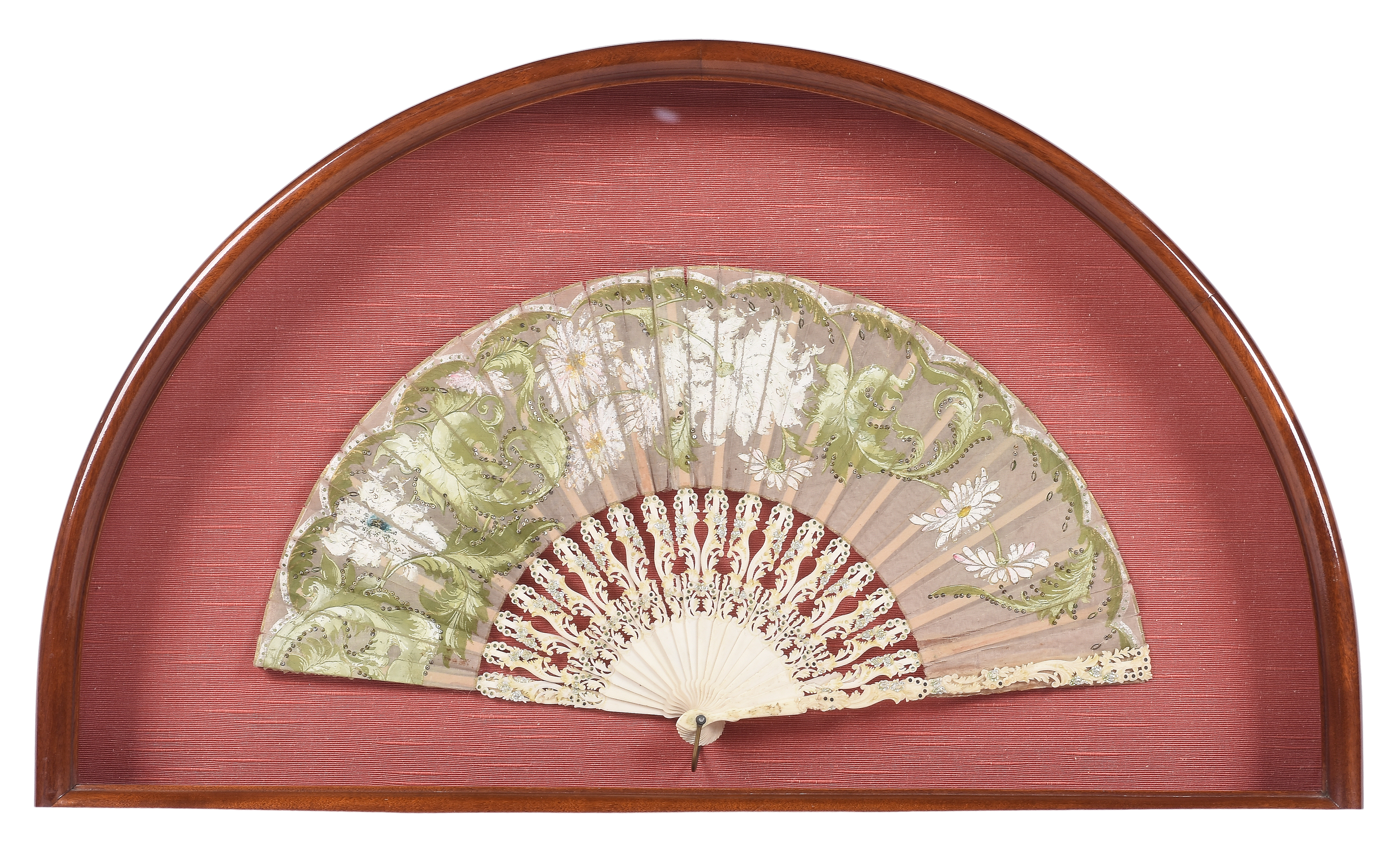 Abanico con varillaje realizado en hueso y país realizado en tela pintada, decorado con motivos vegetales.