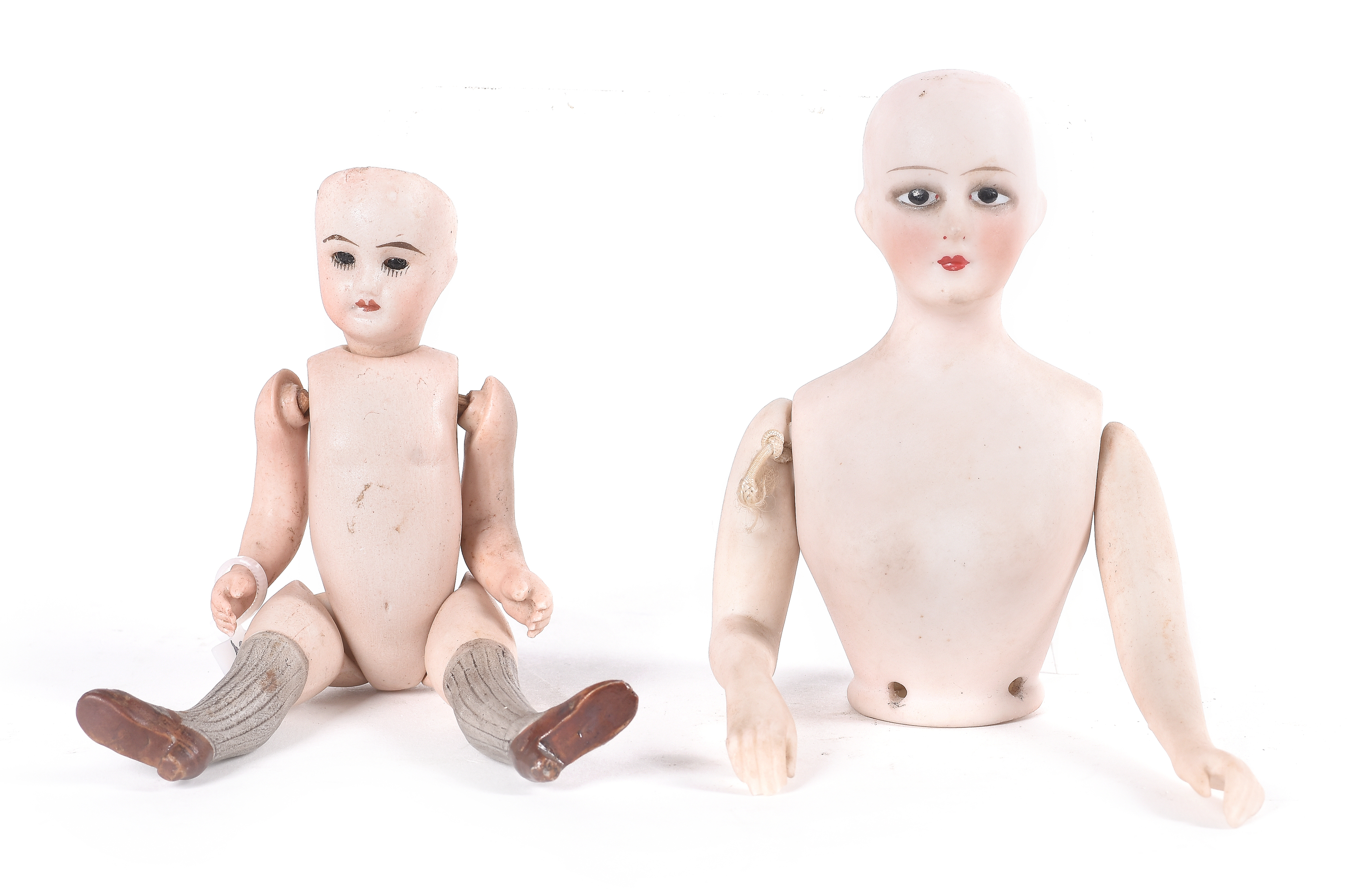 Lote compuesto por dos muñecas: torso de muñeca realizado en porcelana (marca desconocida) y muñeca realizada en porcelana de la marca SFBJ (Societé Française de Fabrication de Bébés et Jouets), modelo Nº 4.