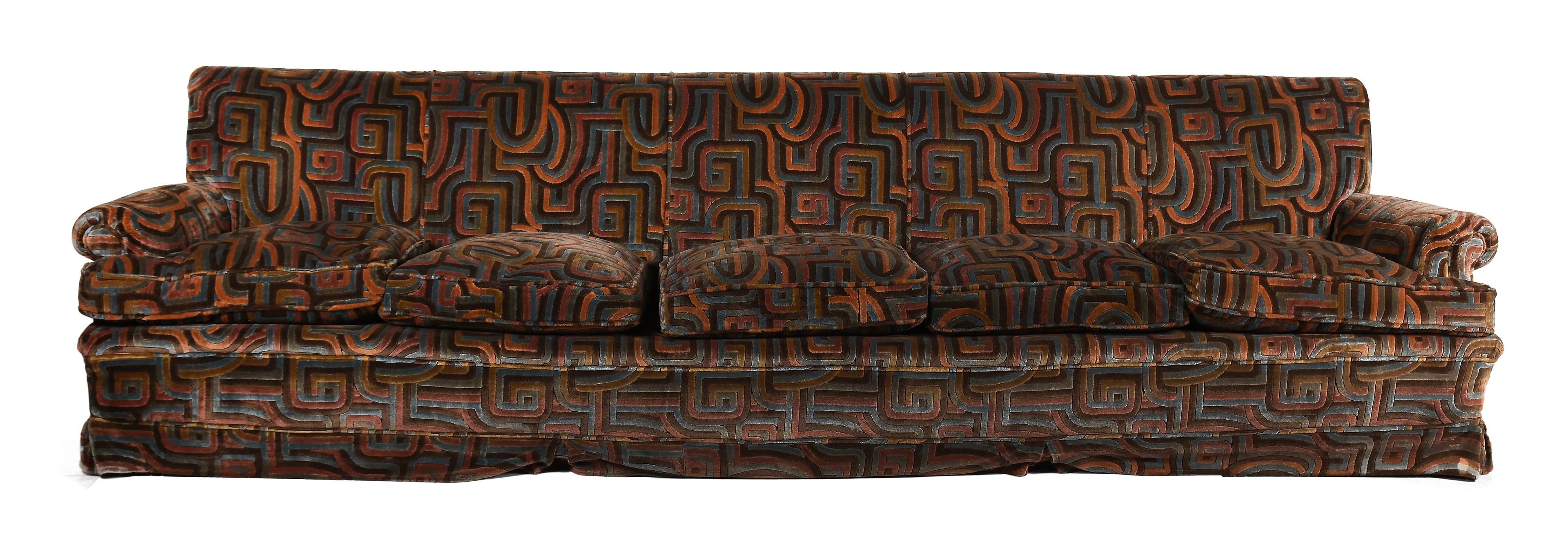Sofá de cinco plazas tapizado con motivos geométricos. Tapicería original.