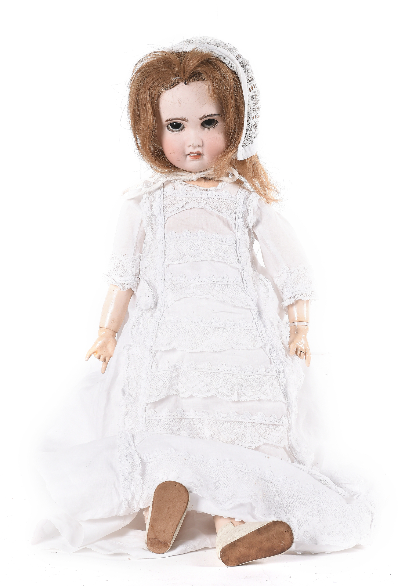 Muñeca articulada realizada en biscuit y papel mache. Marca SFBJ (Societé Française de Fabrication de Bébés et Jouets), modelo Nº 7. París. Con faltas en los dedos.