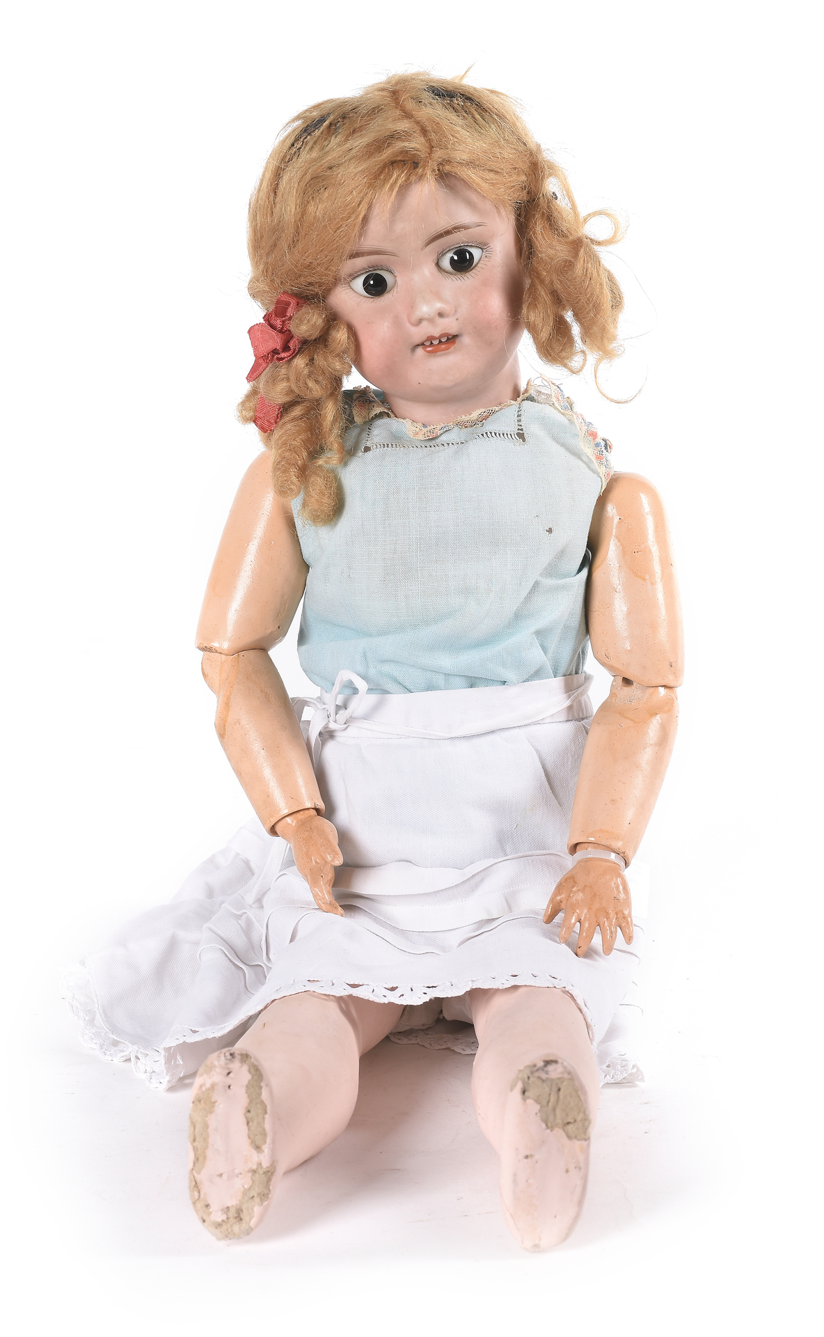 Muñeca articulada realizada en porcelana y papel maché. Marca "5" en la nuca. Con faltas en los dedos.