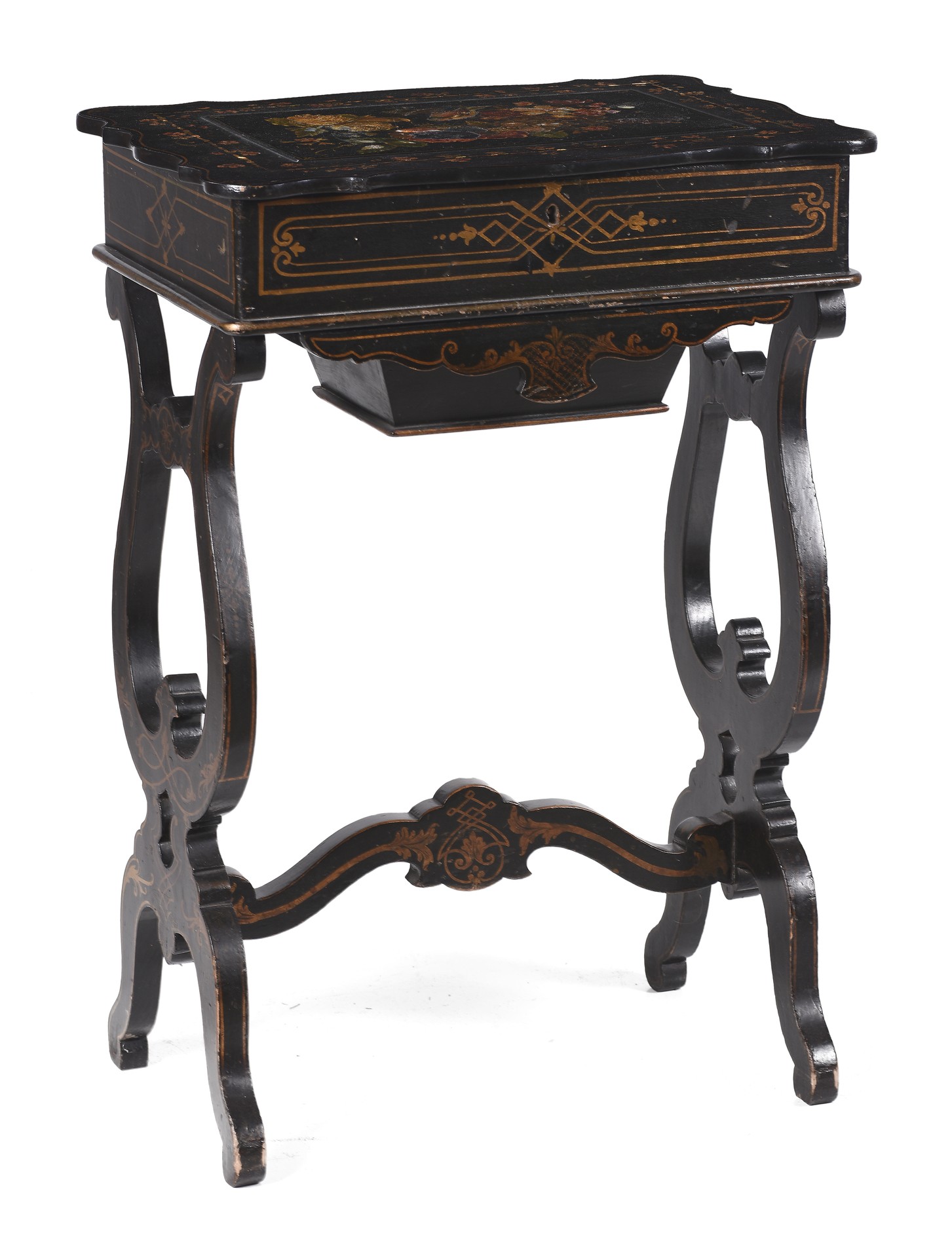 Mueble costurero realizado en madera con incrustaciones de nácar y decoración floral. Época Isabelina.