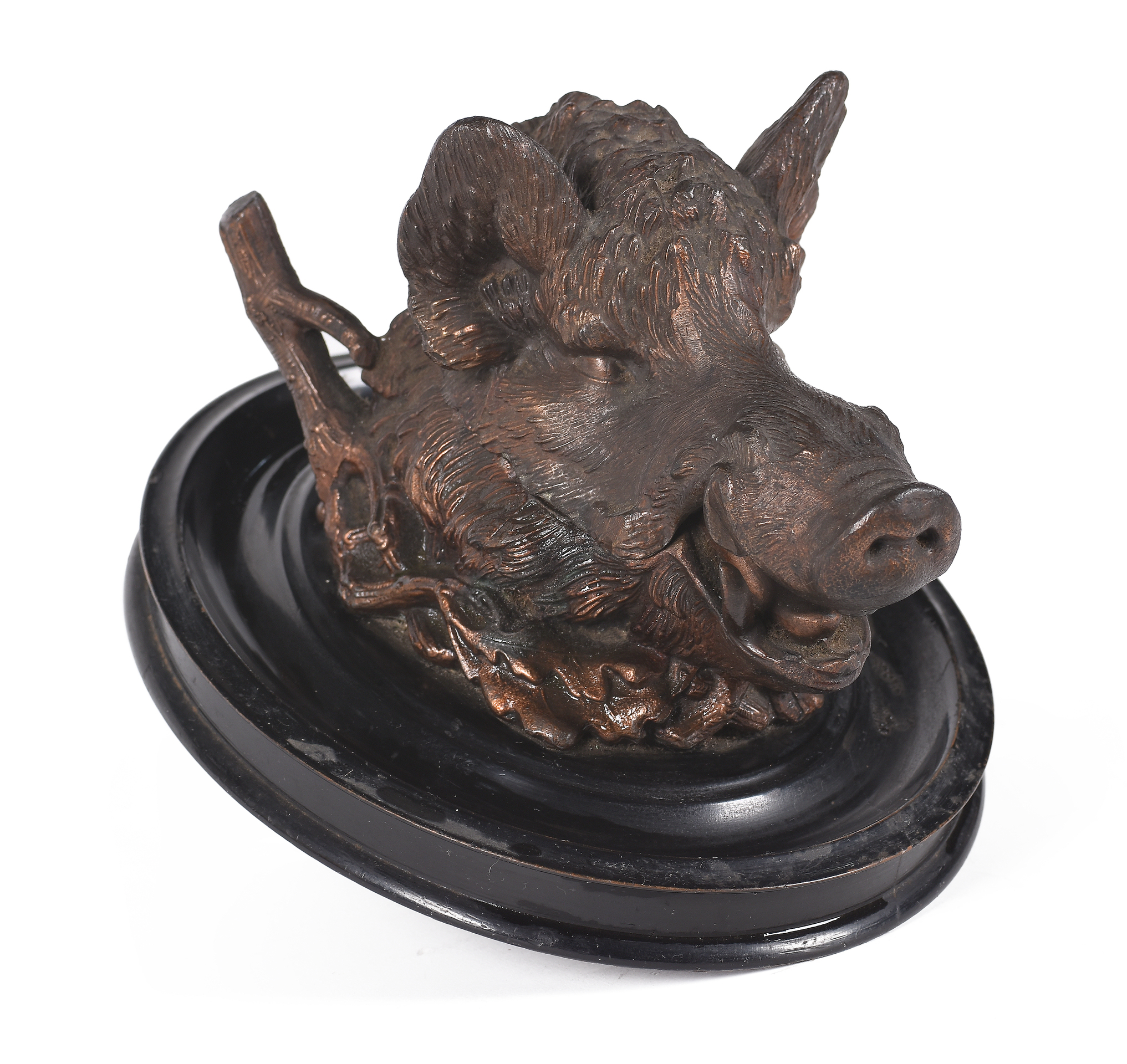 Tintero realizado en metal representando "Cabeza de jabalí".