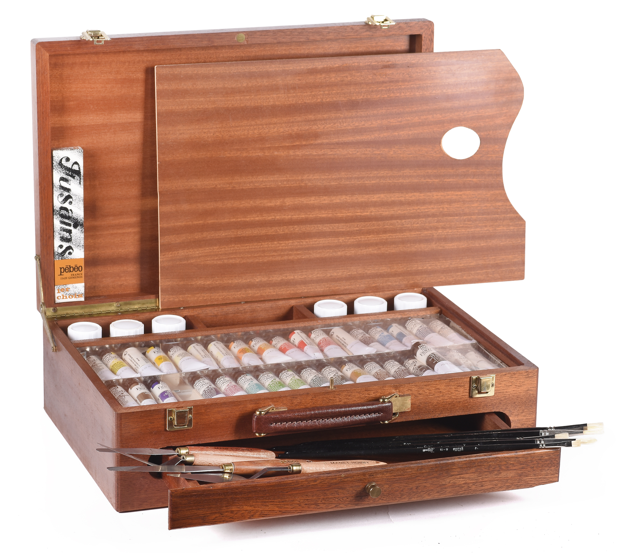 Maletín realizado en madera con tubos de pintura al óleo, pinceles, espátulas y paleta. Marca Pebeo.