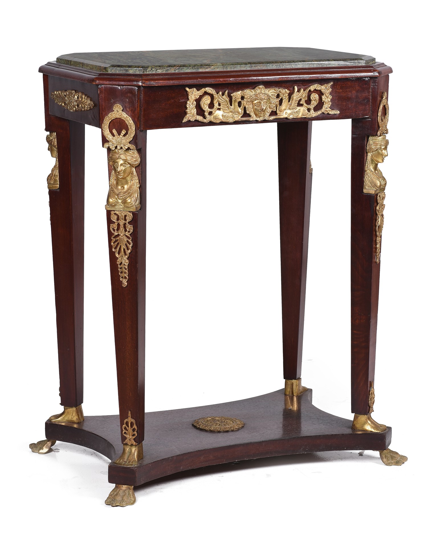 Mesilla realizada en madera de caoba con decoración de bronces dorados representando "Musas". Estilo Imperio.