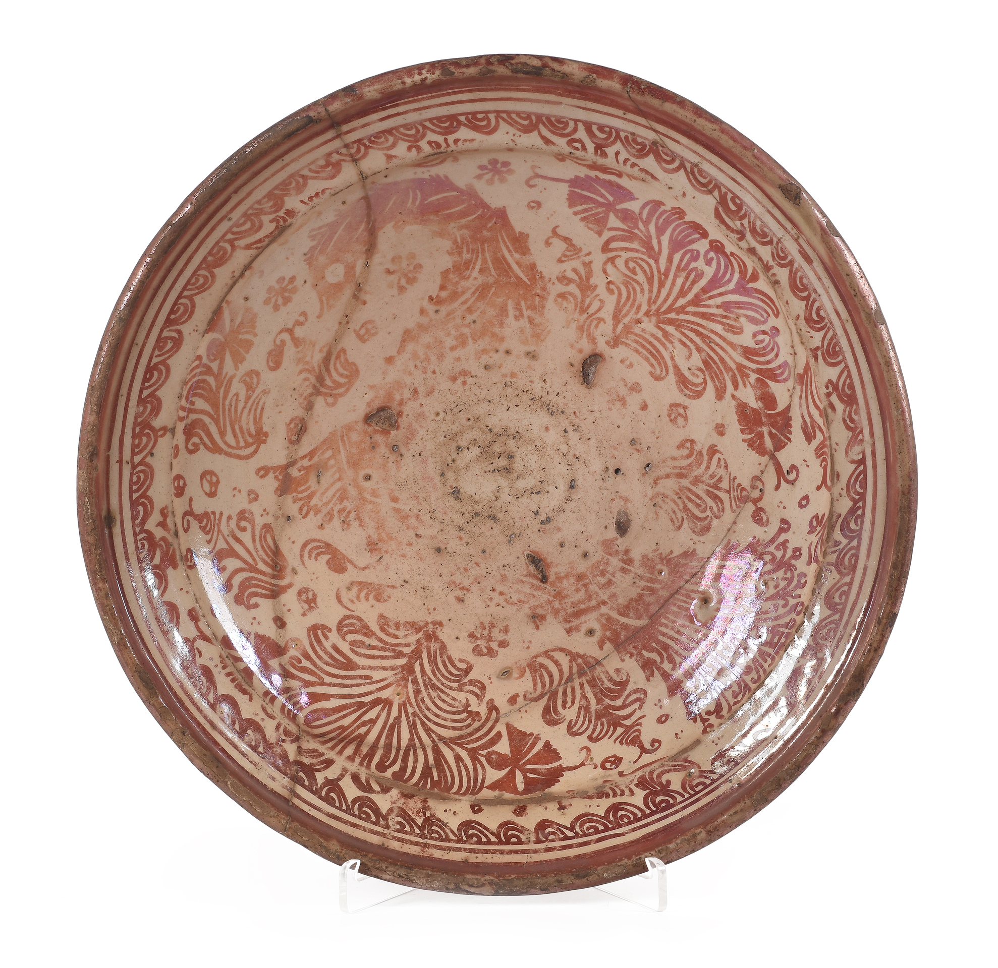 Plato realizado en cerámica de reflejo. Manises, Valencia. Con antigua restauración.